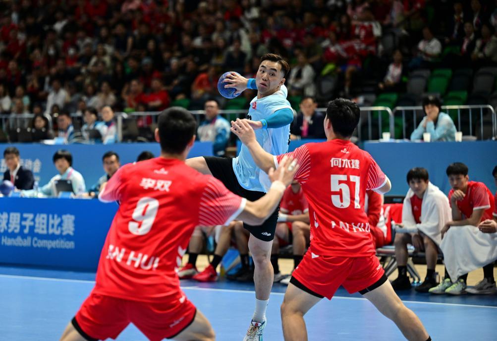 ↑11月8日,在香港进行的第十五届全国运动会男子手球半决赛中,香港队球员连润滔(中)在比赛中射门。新华社记者 于洋 摄 在已完赛的公路自行车男子个人赛中 运动员们沿途饱览粤港澳三地风光 实现六次“无感通关”的顺畅体验 三地携手筹划、密切配合 不仅保障赛事顺利进行 也为大湾区在 更广领域、更深层次的融合发展 积累了宝贵的“全运经验”