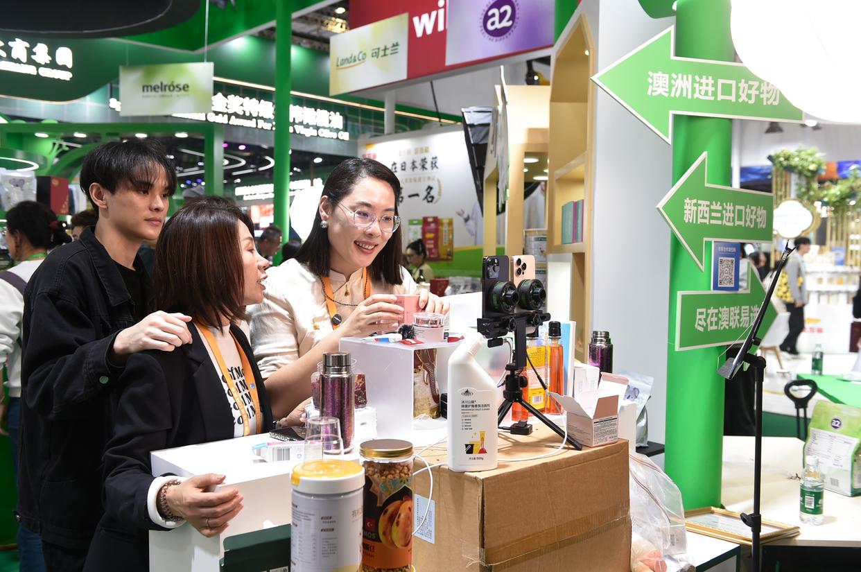 11月9日,工作人员在第八届进博会农食产品展区现场进行直播销售。新华社记者 鲁鹏 摄