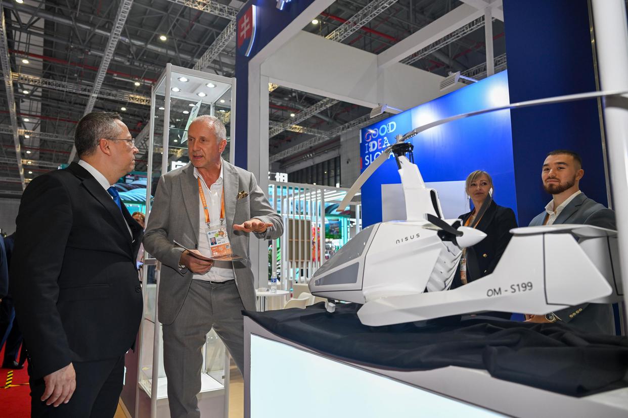11月5日,在第八届进博会国家展斯洛伐克馆,参展商(左二)在向嘉宾(左一)介绍一款飞机产品。新华社记者 陈浩明 摄