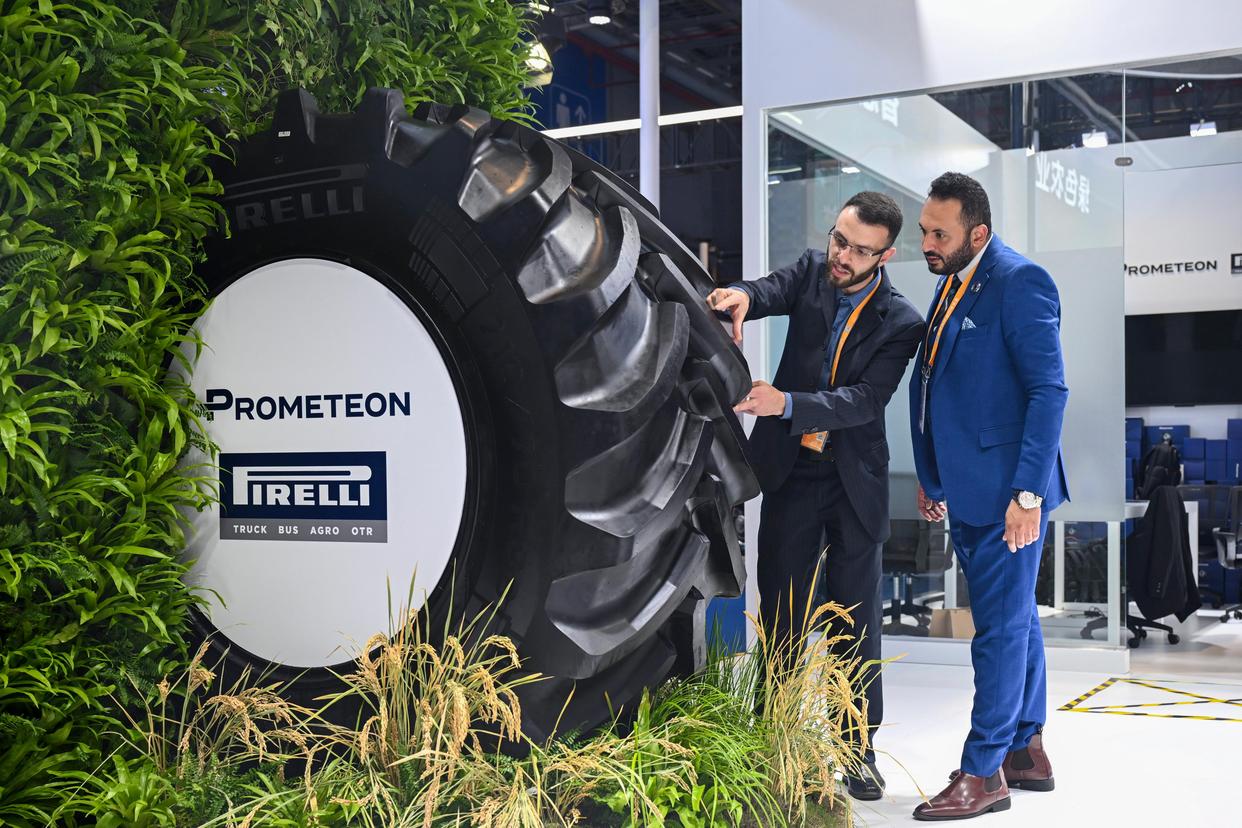 11月6日,在第八届进博会汽车及智慧出行展区百得安轮胎集团展台,展商在亚洲首发产品绿色农业轮胎AT02前交流。 新华社记者 陈浩明 摄
