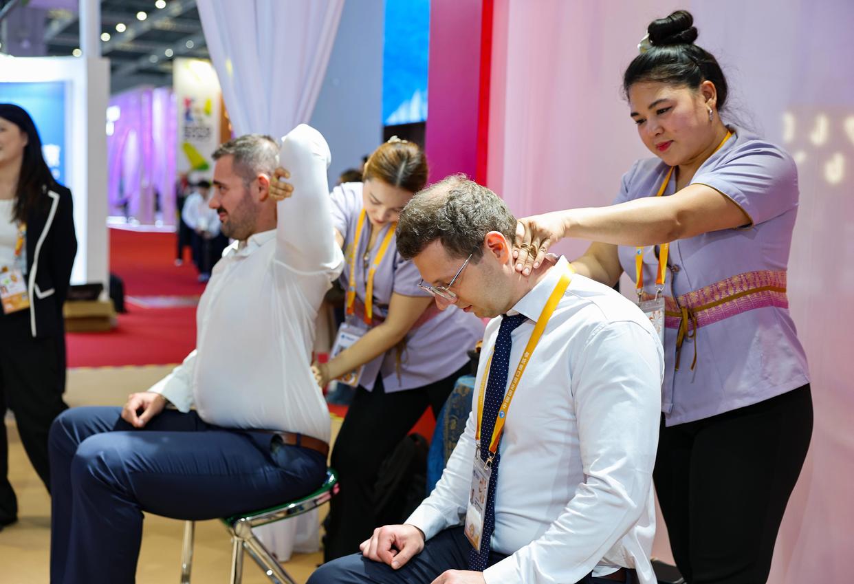 11月5日,人们在第八届进博会国家展泰国馆体验泰式按摩。新华社记者 王泽聪 摄
