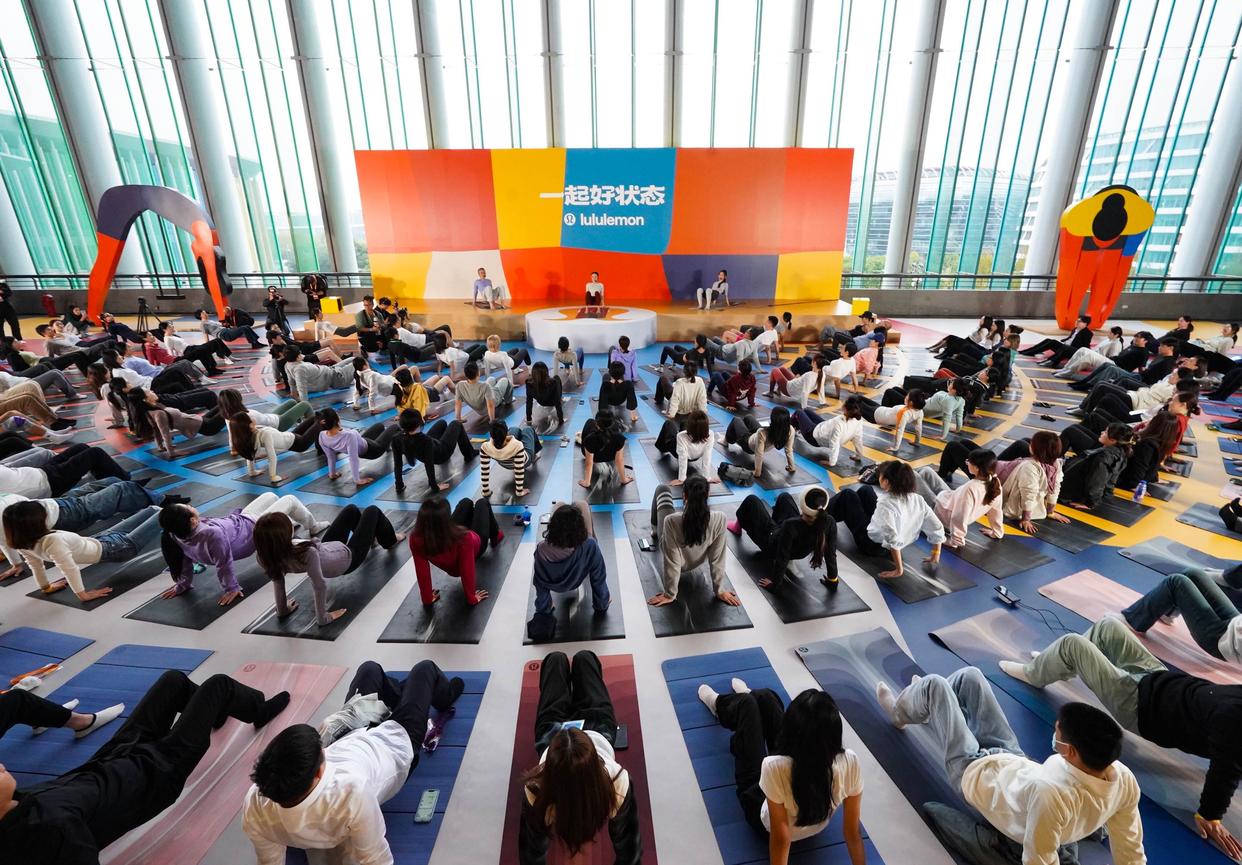 这是11月8日在第八届进博会消费品展区外拍摄的露露乐蒙主办的百人瑜伽活动。新华社记者 杜昕怡 摄