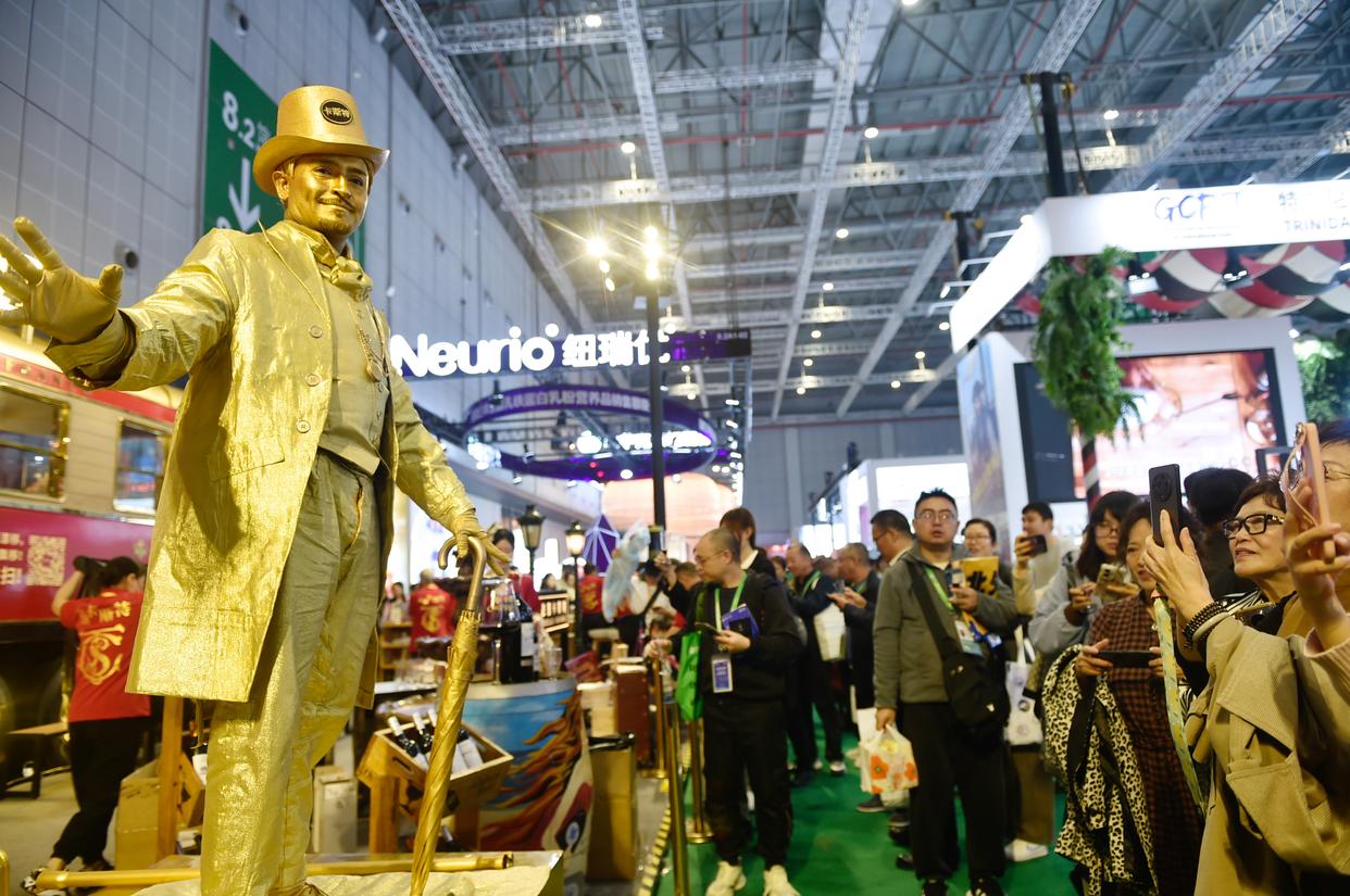 11月9日,演员在第八届进博会农食产品展区与观众互动。新华社记者 鲁鹏 摄