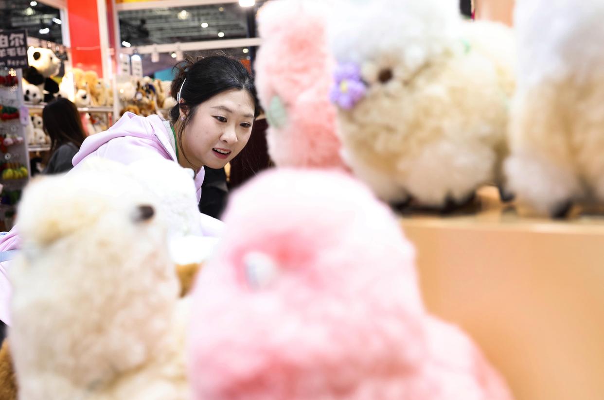 11月8日,在第八届进博会消费品展区,参观者在秘鲁温暖驼品牌的羊驼毛制品前驻足观看。温暖驼是进博会八届“全勤生”。新华社记者 方喆 摄