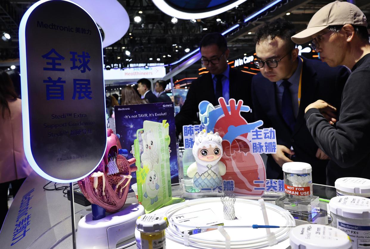 11月6日,参观者在第八届进博会美敦力公司一款超硬导丝产品展台前驻足观看。这是该产品的全球首展。新华社记者 方喆 摄