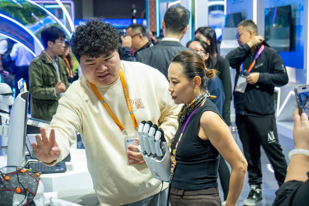 11月5日,观众在第八届进博会国家展中国馆了解非侵入式脑机接口机器人。新华社记者 丁赫 摄