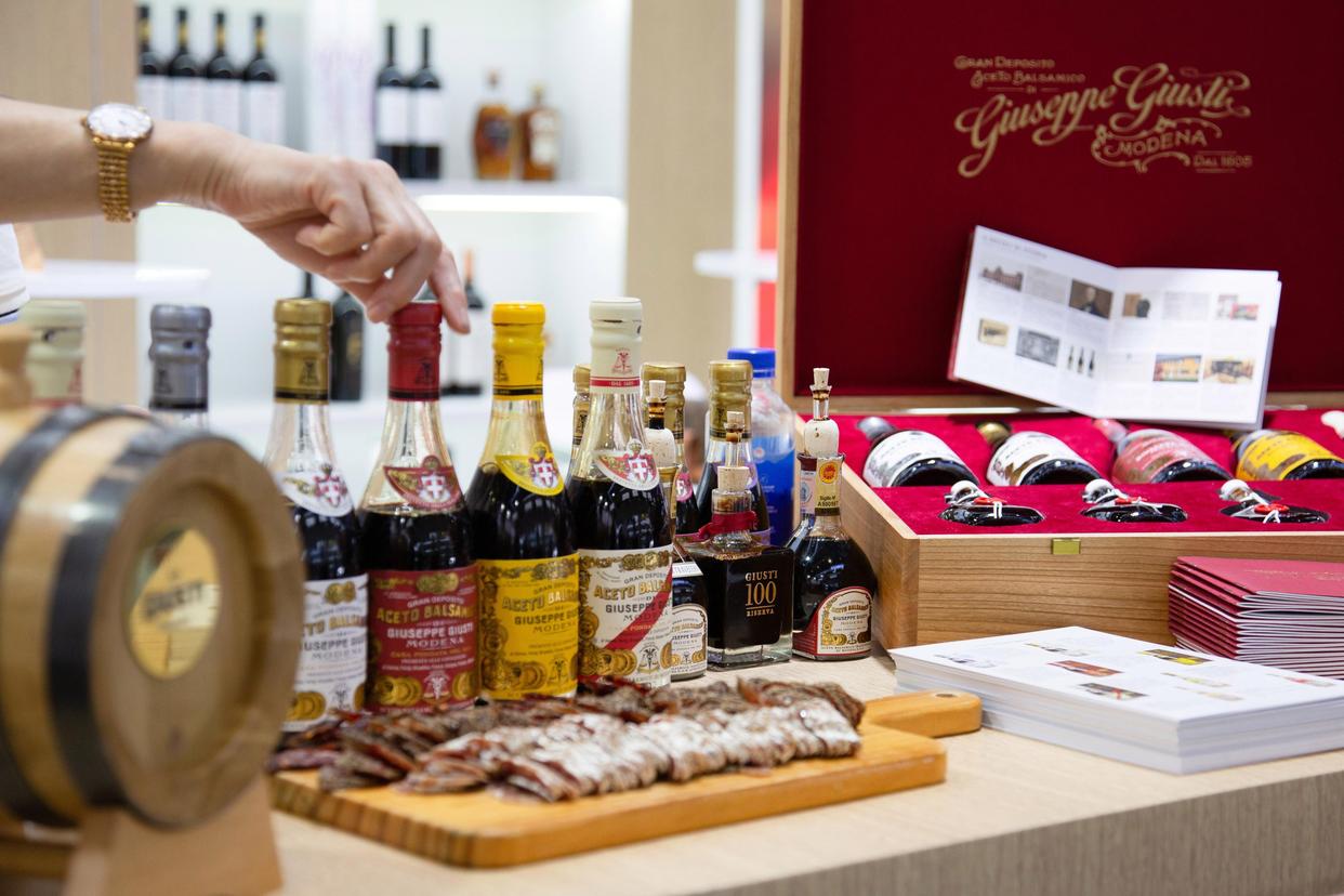 这是11月7日在第八届进博会农食产品展区一处展台内拍摄的意大利黑醋。新华社记者 田薇薇 摄