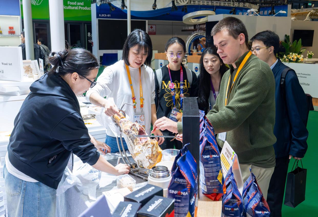 11月5日,在第八届进博会农食产品展区,参展商为观众介绍伊比利亚火腿。新华社记者 周荻潇 摄 “四叶草”中举办的进博会 不断书写着中国与世界 开放融通 合作共赢 共享未来的生动故事