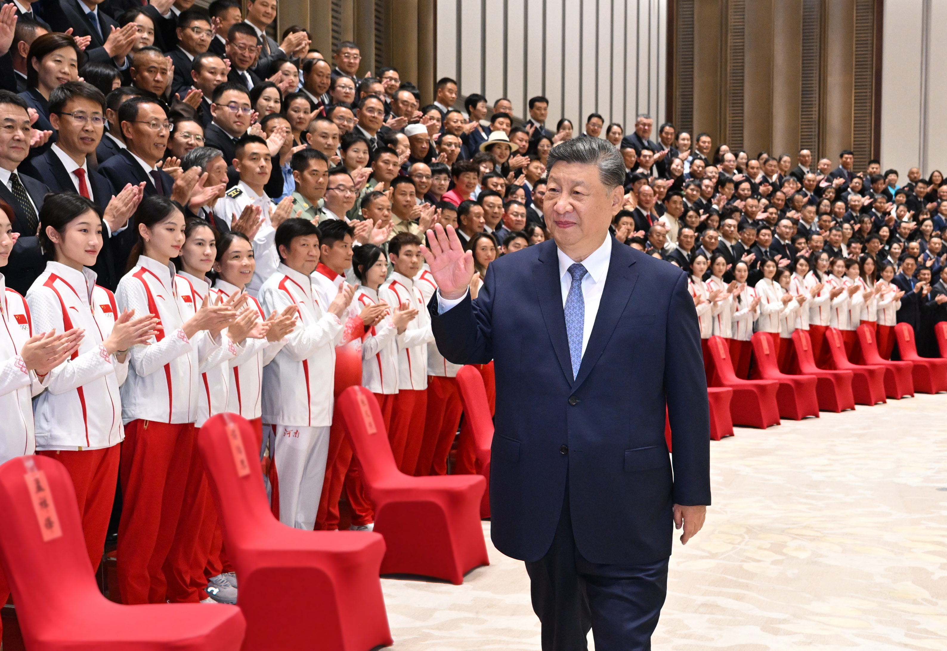 11月9日下午,中共中央总书记、国家主席、中央军委主席习近平在广州亲切接见全国群众体育先进单位、先进个人代表和全国体育系统先进集体、先进个人代表,并同大家合影留念。新华社记者 申宏 摄 新华社广州11月9日电 在第十五届全国运动会即将开幕之际,中共中央总书记、国家主席、中央军委主席习近平9日下午在广州亲切接见全国群众体育先进单位、先进个人代表和全国体育系统先进集体、先进个人代表,向他们表示热烈祝贺,勉励他们奋力拼搏、再创佳绩,为建设体育强国作出新贡献。