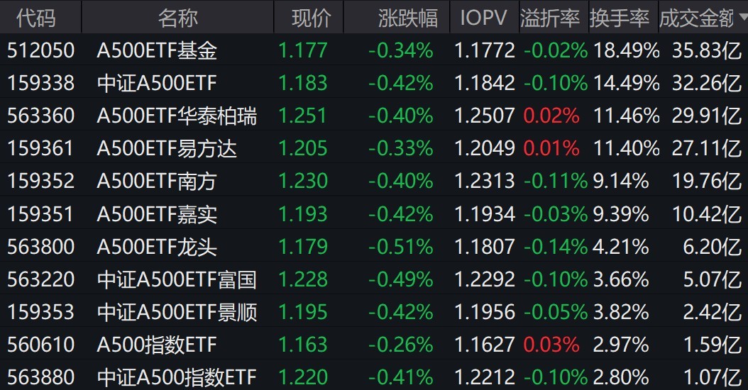 每经记者|叶峰 每经编辑|肖芮冬 市场早盘震荡下跌,创业板指跌超2%,中证A500指数下跌0.33%。 盘面上,锂电池板块反复活跃,磷化工概念延续强势,大消费板块爆发。下跌方面,算力硬件概念股集体走弱。 截至上午收盘,场内跟踪中证A500指数的ETF小幅下跌。其中,有11只中证A500相关ETF成交额超1亿元,3只超29亿元。A500ETF基金、中证A500ETF、A500ETF华泰柏瑞早盘成交额分别为35.83亿元、32.26亿元、29.91亿元。 有券商表示,第四季度机构资金存在一定止盈高估值板块的动力,市场风格有望走向再平衡。中期来看,在全球科技投资热情不减、“反内卷”政策持续推进、居民储蓄入市等因素支撑下,本轮慢牛行情的根基并未动摇,后续A股指数仍存在继续走强的基础。