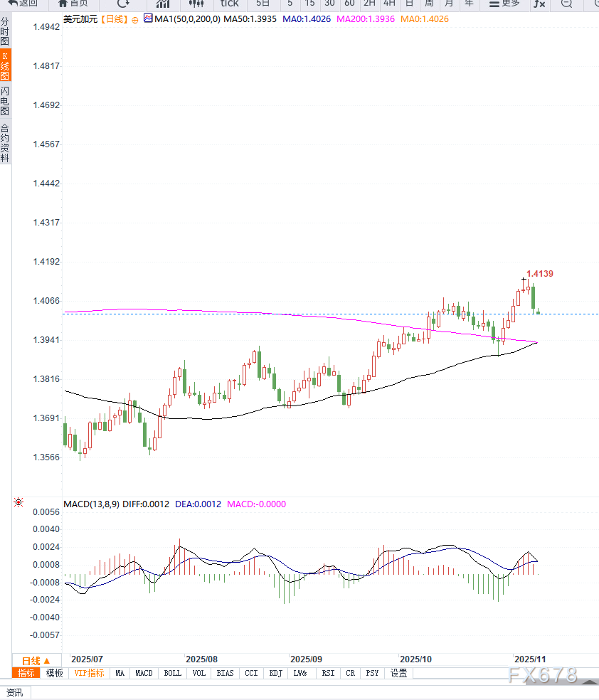 USD/CAD 在亚市早盘交投于1.4030附近,下跌约 0.12%,主要受到加拿大强劲就业数据推动。Statistics Canada 报告显示,10月新增就业 66600 人,远超预期的-2500,同时9月新增就业为60400 人。 ![]() USD/CAD 在亚洲交易时段面临明显卖压,加元几乎对所有主要货币除澳元和新西兰元外均表现强势,其中对日元尤为明显。 美元方面,由于美国政府停摆可能接近结束,市场对美国财政和消费前景预期改善,美元整体表现相对平稳。 参议院预计将在周日投票推进众议院通过的短期拨款法案,该法案将与三项全年拨款法案捆绑,以维持政府运作至2026年1月,并提升受停摆影响的美国消费者信心。 此前,密歇根大学初步消费者信心指数显示,11月下降至 50.3,为三年半新低,凸显消费者信心承压,但美国政府拨款进展可能缓解这一压力。 技术面上,USD/CAD 日线显示短期在1.4030 附近震荡,下方支撑位约在1.4000附近,阻力位关注 1.4060。整体偏弱,短期仍以加元强势、美元承压格局运行。 ![]() USD/CAD 当前行情呈现加元走强 vs 美元承压的格局。加拿大就业数据远超预期,失业率下降至 6.9%,市场对 BoC 近期加息或降息预期有所调整,为加元提供支撑。 美元因美国政府停摆可能结束而表现平稳,但消费信心低迷的潜在风险仍存在。