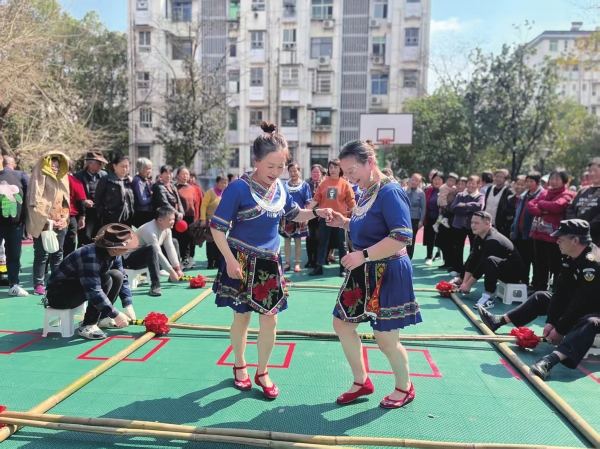 七斗冲社区开展“燃情篝火·共舞民族风”活动,居民在跳竹竿舞。本文配图均为蔡奕 摄(湖南图片库)
