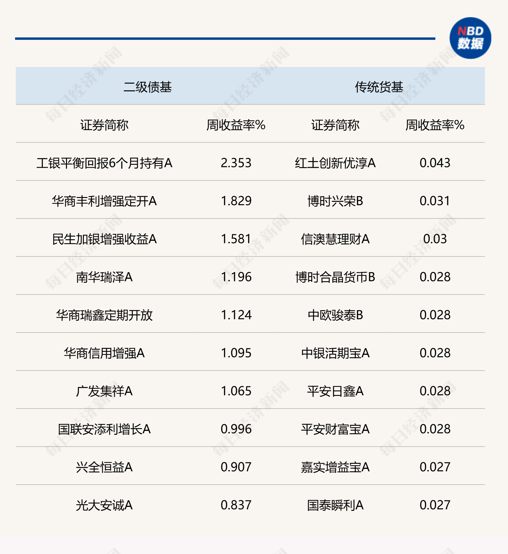 说明:上周各类公募债基头部业绩产品统计 来源:Wind 封面图片来源:每日经济新闻 |