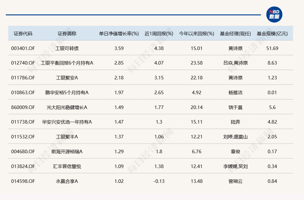 每经记者|肖芮冬 每经编辑|赵云 11月10日,市场探底回升,三大指数涨跌不一,沪指午后翻红后震荡拉升,创业板指跌幅收窄。板块方面,白酒、旅游及酒店、免税店等板块涨幅居前,燃气、风电设备、机器人等板块跌幅居前。全市场超3300家股票上涨。沪深两市成交额2.17万亿元,较上一个交易日放量1754亿。 下面一起来看今天公募基金的表现。 (注:榜单1、榜单2仅选取灵活配置型、偏股混合型和普通股票型三类产品作为主动基金的代表,纳入统计;债基相关榜单包括各类主、被动债券型基金) 1.单日涨幅榜