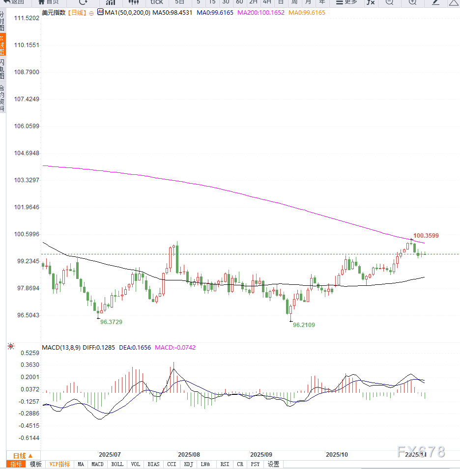 周二亚洲交易时段,美元指数(DXY)稳守在 99中上区间,反映美元在一系列利多消息下仍保持支撑。 ![]() 这种不确定性使交易员对美元采取更为保守的策略,暂时抑制了其进一步上行。 与此同时,美联储降息预期升温也对美元构成压制。 CME FedWatch 工具显示,市场认为 12 月降息的概率已超过 60%。上周五发布的密歇根大学消费者信心指数进一步佐证了市场的谨慎态度,11 月消费者信心降至 50.3,为 2022 年 6 月以来最低水平,而前值为 53.6。 疲软的消费者信心反映出经济增长承压,强化了投资者对美联储未来降息的预期,也对美元形成下行约束。 此外,美国周二因退伍军人纪念日休市,使美元缺乏交易推动力,短期内将继续受到美联储利率政策预期的主导。 市场焦点将集中于周三多位 FOMC 官员的讲话,投资者将寻求对未来降息路径的进一步指引,以决定美元在近期的需求和波动方向。 “美元指数短期守住99上方,但市场仍在观望经济数据和政策信号。美联储潜在降息预期已被充分计入,投资者不宜贸然追多。” —— 外汇策略分析师 从日线图来看,美元指数在 9日EMA 上方盘整,短线多空力量处于胶着状态。RSI 指标徘徊在 50 附近,显示市场缺乏明确趋势。 若美元指数突破99.60 区间上方阻力,可能打开向 100 的上行空间,但若跌破98.90 支撑,则短线可能延续回调。整体来看,美元的短期走势仍以政策信号和经济数据为主导。 ![]() 美元指数当前走势表明,虽然美国政府关门危机缓解提供了基本支撑,但市场对未来经济增长和美联储政策方向仍高度敏感。 短期应保持谨慎,关注周三 FOMC 官员讲话和后续经济数据披露,以寻找明确交易信号。美元短线可能在 98.80—99.60 区间内震荡,方向性突破需依赖政策或数据的明确指引。