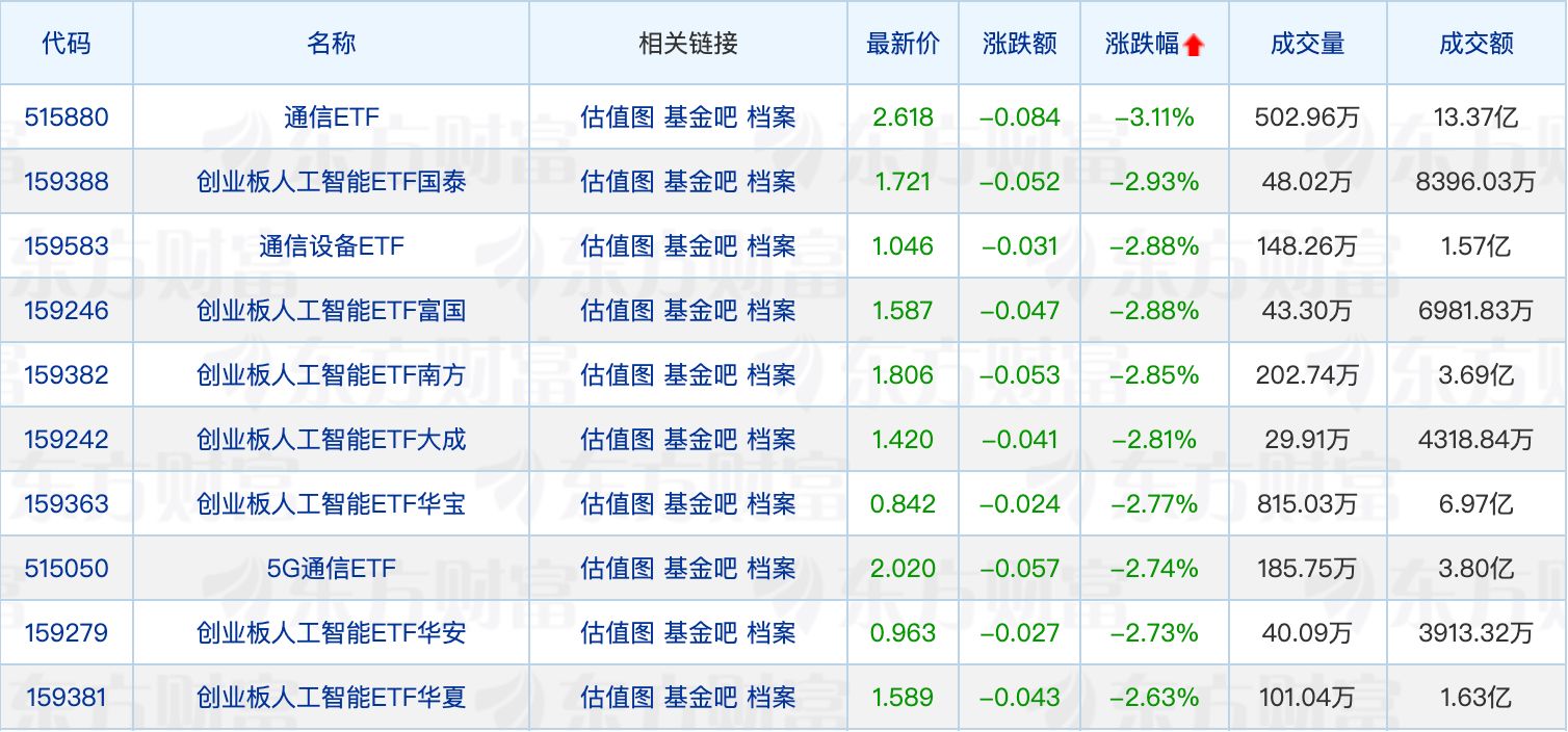 下跌方面,通信ETF领跌3.11%,创业板人工智能相关ETF悉数回调。