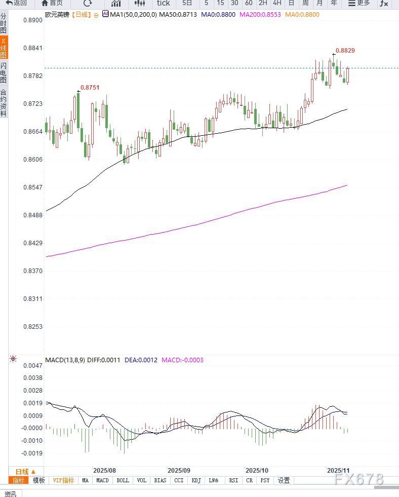 EUR/GBP 在周二欧洲早盘维持升势,目前交投于 0.8800 附近,此前已成功终止连续四个交易日的回落。 ![]() 薪资方面,剔除奖金的平均薪资 在同一期间录得 4.6% 年率增长,虽然符合市场预期,但较前值 4.7% 略有回落。包括奖金的平均薪资 年率增长为 4.8%,同样低于市场预期和前值(此前为 5.0%)。 薪资增速的放缓意味着薪资推动通胀压力减弱,使英格兰央行进一步维持宽松观望态度的可能性增大。 除英镑疲弱带来的推动外,欧元(EUR)也受到欧洲央行(ECB)政策预期的支撑。市场普遍预期 ECB 将维持利率不变,因为欧洲通胀正在逐步接近目标水平。当前,货币市场仅定价 40% 的概率ECB 在 2026 年 9 月降息。 这增强了欧元的相对吸引力。 值得注意的是,欧洲央行副行长 Luis de Guindos 周一表示,目前的利率水平是“合适的”,并强调政策应保持谨慎与克制。他指出,尽管近期欧美之间的贸易紧张情绪有所缓和,但 ECB 仍需关注未来的不确定性。 从 EUR/GBP 日线图 来看,该货币对已经自 0.8730 附近关键支撑位展开反弹,并站上 9 日指数移动平均线(EMA),显示短线多头动能增强。 14 日相对强弱指标(RSI)维持在 50 上方,表明买方情绪占优。若价格能持续稳定在 0.8800 上方,下一关键阻力看向0.8860附近,突破后可能打开进一步上涨空间; 反之,若回落失守 0.8780,将重新面临调整压力。 “当前政策利率是合适的,欧洲央行必须保持非常谨慎与保守的立场。” —— 欧洲央行副行长 Luis de Guindos ![]() 英国就业数据全面走弱,已成为推动英镑下跌的核心变量。 失业率上升 + 薪资增速放缓 → 通胀压力下降 → 降息预期增强。 相比之下,欧洲央行维持“观望 + 谨慎”立场,利率政策差异支持 EUR/GBP 延续反弹趋势。