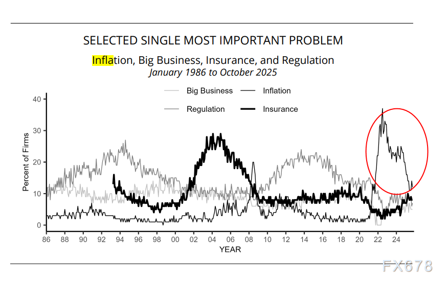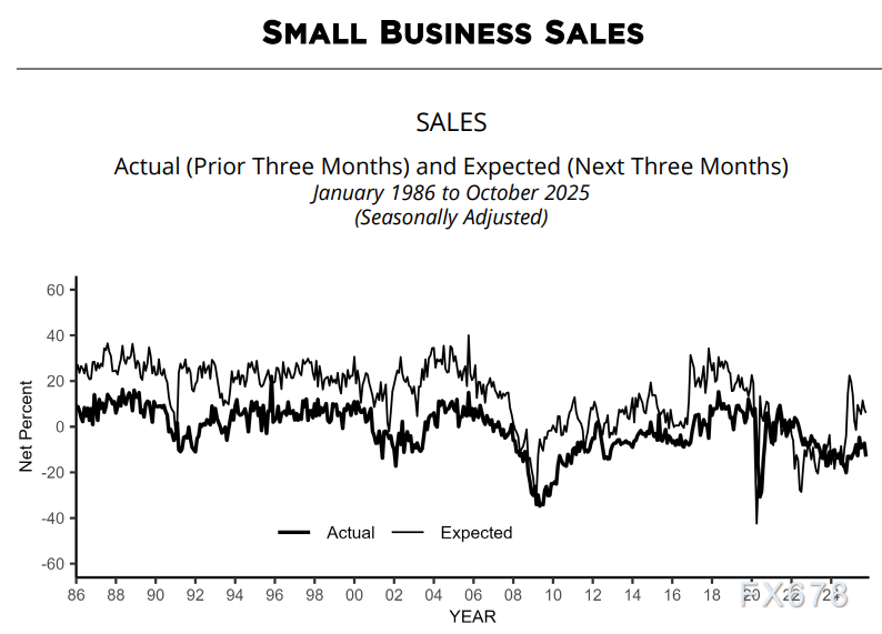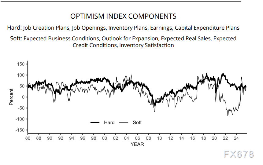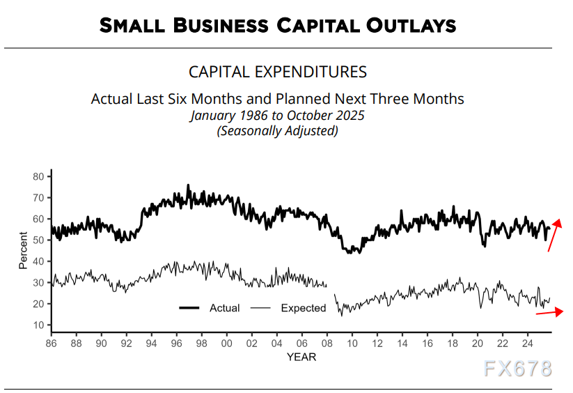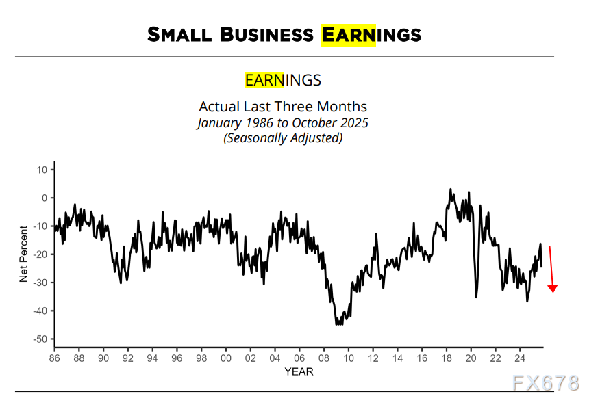 10月小企业乐观指数为98.2,较9月下降0.6个百分点,但仍高于52年平均值98。报告指出NIFB指出,建筑、运输和零售行业的劳动力市场仍然紧张,盈利趋势恶化是乐观指数下滑的主要原因,10个构成指标中4升5降1持平。10月不确定性指数降至88(今年以来最低),但仍处于历史高位,主因企业主对扩张前景的不确定性降低。 ![]() 资本支出超预期发展 55%的企业主报告过去六个月有资本支出(较9月降1个百分点),主要用于新设备、车辆及设施改善。 23%的企业主计划未来六个月进行资本支出(较9月升2个百分点),整体资本支出略显乏力。 下图显示实际资本支出与预期资本支出背离,可能在于企业经营条件恶化与成本上升。 ![]() 销售与库存也收到冲击 经季节性调整后,60%的企业主受供应链中断影响(较9月降4个百分点),其中39%为轻微影响,39%未受影响,13%的企业主报告过去三个月名义销售额增长(较9月降6个百分点)。 下图可以看出中小企业乐观预期受到提振后实际销售水平与预期背道而驰。 ![]() 26%的企业主报告提高了薪酬(较9月降5个百分点),19%计划未来三个月提薪(与9月持平),盈利呈正增长趋势的企业主净比例为-25%(经季节性调整,较9月降9个百分点),是乐观指数下滑的最大推手。 盈利下降的企业主中,33%归咎于销售额下滑;盈利增长的企业主中,53%归因于销售额增长。 下图显示盈利出现大幅下滑 ![]() 信贷市场现实信贷成本维持高位 5%的企业主报告最近一次贷款更难获得(较9月降2个百分点),1%报告贷款利率上升(较9月降6个百分点)。10月短期贷款平均利率为8.7%,较9月下降0.1个百分点。23%的企业主有定期借款行为(较9月降3个百分点)。 下图显示信贷条件大幅恶化,近期维持在高位。 ![]() 通胀反而成了最不用担心的 21%的企业主提高了平均销售价格(经季节性调整,较9月降3个百分点),仍高于13%的月度平均水平,通胀压力持续。 30%的企业主计划未来三个月提价(经季节性调整,较9月降1个百分点)。 12%的企业主将通胀(投入成本上升)列为首要经营问题(较9月降2个百分点)。 下图显示通胀水平大幅改善,但是其他条件均在恶化。 ![]() 基于上述数据,美国小企业面临的劳动力市场压力正在从“量”的短缺向“质”的困境深化演变,这构成了劳动力市场实质性恶化的关键信号。 表面上看,职位空缺率保持稳定,整体招聘活动略有降温,似乎显示劳动力市场的极度紧张有所缓解。然而,核心矛盾已悄然转移:“劳动力质量”以显著优势取代税收和通胀,成为企业主的首要经营困扰,这一现象揭示了市场恶化的深层结构性问题。尤其是建筑行业,近半数企业主深受其困,表明技能错配正在特定行业演变为产能瓶颈。 这种质的下滑与企业盈利能力的急剧恶化直接关联。一方面,企业为争夺有限的高质量劳动力被迫维持高薪酬预期,推高运营成本;另一方面,熟练工人的持续短缺直接制约了生产效率与业务扩张能力。其结果是,盈利趋势成为拖累乐观指数的最大负担,形成了一个“高成本、低效率”的恶性循环。 尽管不确定性指数有所下降,但这更多源于企业主在疲软数据下降低了扩张预期,而非实际经营环境改善。当超过四分之一的企业将“找不到合适的人”视为头号难题时,这不仅是一个招聘挑战,更是美国经济生产力潜能受损的警报。劳动力市场的根基正在被侵蚀,其后续影响将从企业盈利端蔓延至更广泛的经济增长动力。
