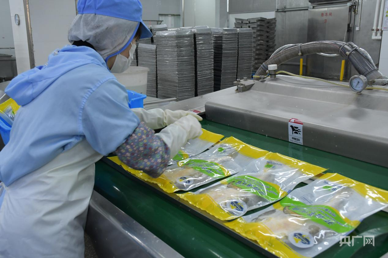 三都澳白基湾某养殖基地渔排上,工作人员正在投喂饵料(央广网发 张语欣 摄) 沿着三都澳西南岸向西行,飞鸾镇的一家大黄鱼精深加工企业的车间里,工人们麻利地给大黄鱼分级、剖片、去刺、速冻、包装,一气呵成之下,鲜鱼转眼或变成“三去”大黄鱼,或被制成黄鱼鲞等产品。 “过去只卖鲜鱼,现在我们育苗、养殖、加工、销售一条龙,产品销到海外。”该企业负责人石峰的话,道出了产业升级的逻辑。 这家精深加工企业将国际标准贯穿加工流程,让大黄鱼从渔业产品变成食品工业产品;线上直销、快餐场景的拓展,让传统水产有了稳定消费需求;全产业链的构建,更是重构了产业格局。从“单养一条鱼”到“做全一条链”,蕉城大黄鱼的竞争力,正源于这份产业链的韧性。