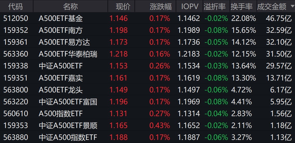 每经记者|叶峰 每经编辑|肖芮冬 市场早盘探底回升,中证A500指数上涨0.33%。 从板块来看,机器人概念集体上涨,商业航天概念延续强势,福建板块反复活跃。下跌方面,海南板块表现疲软。 截至上午收盘,场内跟踪中证A500指数的ETF小幅上涨。其中,有11只中证A500相关ETF成交额超1亿元,3只超32亿元。A500ETF基金、A500ETF南方、A500ETF易方达早盘成交额分别为46.75亿元、32.59亿元、32.1亿元。 有券商表示,中期来看,随着机构资金逐步开始布局2026年方向、美联储降息靴子落地、“AI投资泡沫”担忧阶段性消退,A股市场或将迎来新一轮做多窗口期。