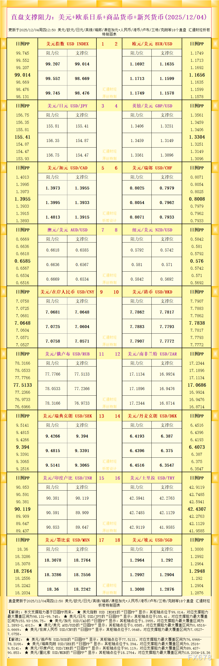 0一张图看直盘支撑阻力:美元+欧系日系+商品货币+新兴货币,更新于2025年12月4日周四12:50,具体美元/欧元/日元/英镑/瑞郎/澳纽加元+人民币/港币/卢布/兰特/克朗等18个直盘,更多详见汇通财经析若特制图表中的内 ...