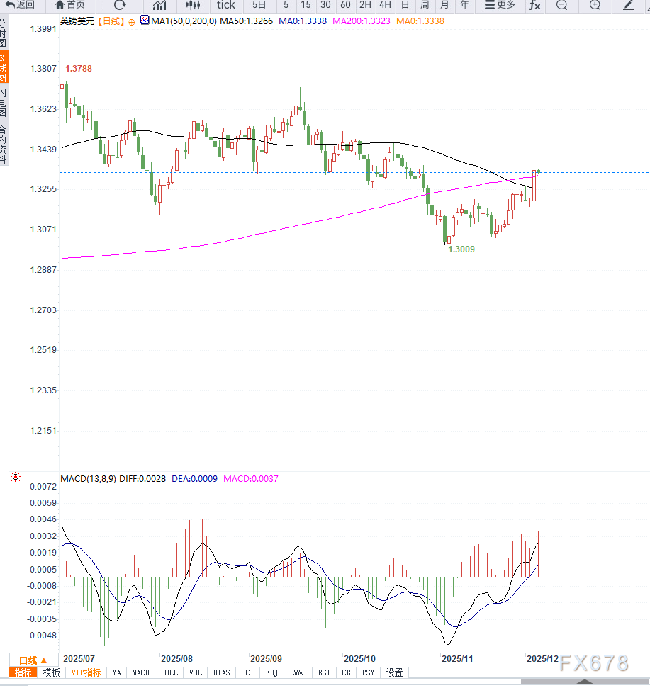 英镑兑美元(GBP/USD)周四亚洲时段回落至1.3330附近,美元需求短线回升,使汇价自近两个月高位震荡下滑。不过,由于美联储下周降息25个基点的概率已升至89%,美元升势或难以持续,限制英镑的进一步下跌。 ![]() 英国方面,英国11月秋季预算强化了市场对英国央行(BoE)12月降息的押注,构成对英镑的压力。英国首相强调通过降低通胀与利率来促进投资增长,市场定价显示英国央行本月降息至3.75%的概率高达90%。 此外,英央行官员Catherine Mann表示,美国若减少对盟友的支持,美元作为全球储备货币的地位可能受到动摇。 整体来看,美英政策均朝向宽松,但美国经济疲弱幅度更大,使GBP/USD短线仍具备韧性。 从日线图观察,GBP/USD近期延续上行结构,但在接近1.3450一带遇到明显抛压,形成阶段性顶部迹象。短线价格回落至1.3320区域,恰处于10日均线与前期突破位的重叠支撑带,若该区域守稳,仍有机会重启上行趋势。 技术指标方面,MACD柱线虽然自高位回落,但仍位于零轴上方,显示中期多头结构尚未被破坏;RSI维持在60附近,处于健康的多头区域。若汇价跌破1.3300整数关,则回调可能扩展至1.3250的20日均线密集带。 上方若能重新站稳1.3400,则趋势将进一步打开通往1.3500的上行空间。 ![]() : 英镑兑美元的技术结构仍偏向上行,但短线进入高位换手区,随时受美国数据与美联储预期影响而产生震荡。美国若在PCE公布中展现进一步降温迹象,则美元跌势可能重新启动,使英镑再度测试前高。 相反,一旦PCE超预期走强,则英镑将面临更深幅度调整。整体趋势仍倾向逢低布局多头,但需关注1.3300关键位的有效性。