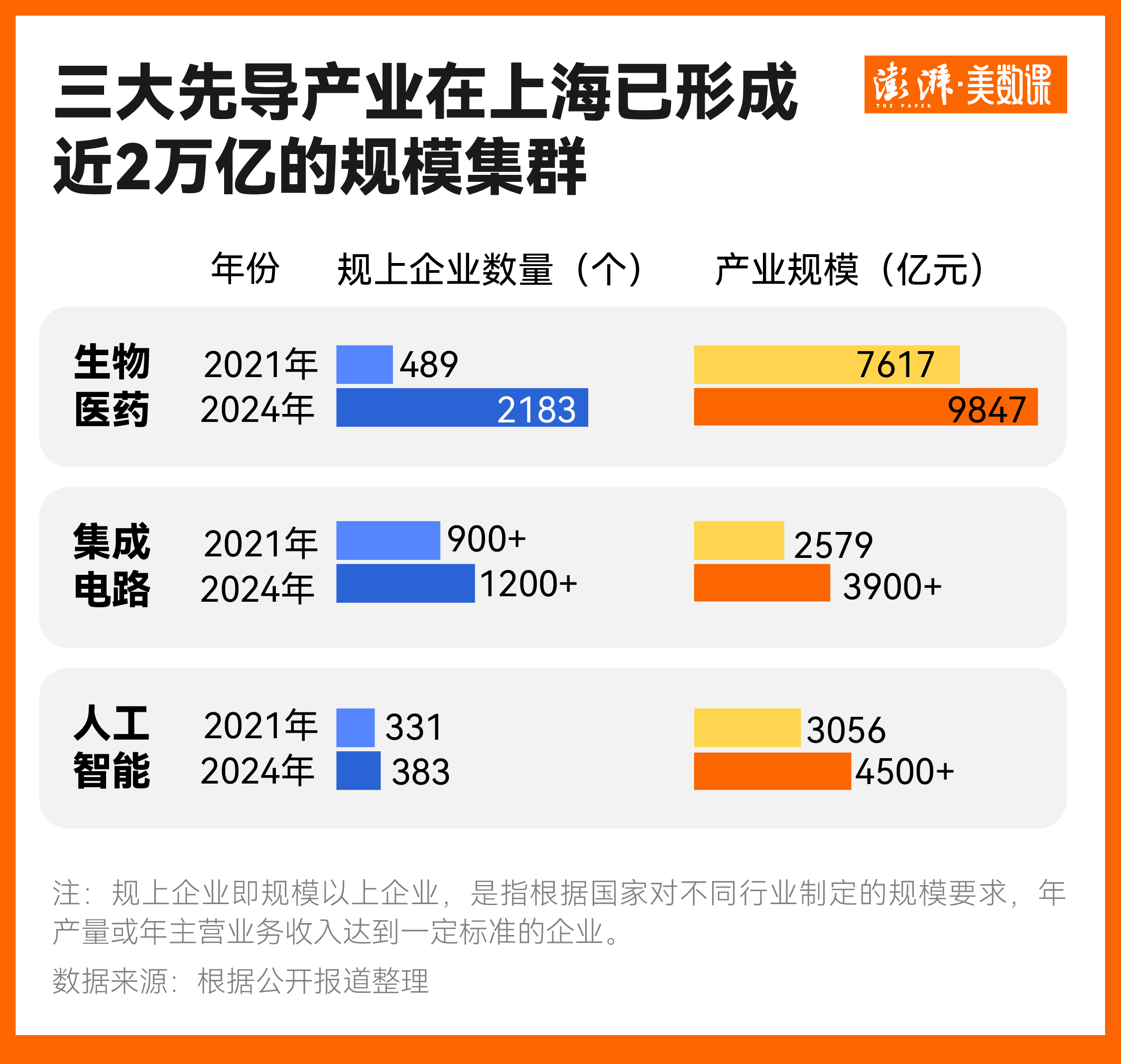 上海以工业立市,轻工业门类齐全,但随着全球科技与产业竞争不断加剧的新局面,寻找新动能迫在眉睫。 2020年,上海市“十四五”规划建议中明确提出了“三大先导产业”的概念,即人工智能、集成电路、生物医药产业。2024年,上海又启动了三大先导产业母基金,实现了当年筹建、当年设立、当年投决的高效运作模式。 如今,三大先导产业制造业已经成为引领上海工业发展的重要动力。 以生物医药产业为例,实施“十四五”规划的第一年即2021年,上海的生物医药规上企业数量是489家,但仅仅3年后的2024年末,这个数字就达到了2183家。国际药企和医疗器械头部20家企业中各有19家在上海设立总部或研发中心。正因为有如此扎实的生物医药产业,前三季度,上海医药品、西药原料药出口分别增长21.5%和40.7%。