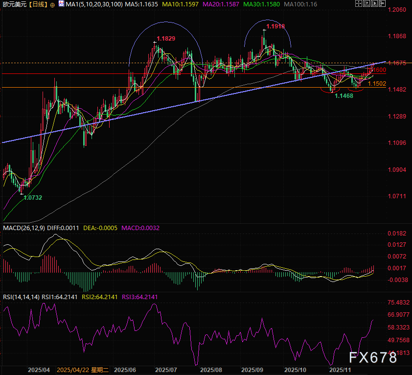 周四(12月4日)亚欧时段,欧元兑美元走出探底回升的走势,汇价继续保持强势,在欧元区零售销售数据公布后小幅获利回吐,汇价继续维持在强势区间,目前交投于1.1671附近。 ![]() 刚刚公布的欧元区零售销售数据的表现超出市场预期。 10月欧元区零售销售额环比增长为0%,扭转了9月环比下降0.1%的态势符合市场预期,同比增速则超出市场1.3%的预期来到了1.5%。 欧元区HCOB服务业采购经理人指数终值上修至53.6,创下两年多来的最快增速,标志着该行业连续第六个月扩张。 同时,法国、德国两大核心经济体的制造业数据均超出市场预期,多重利好共振推动欧元大幅走强。 美元承压逻辑未改 反观美国方面,经济数据表现疲软,尤其是ADP就业人数变化报告显示,11月部门就业人数意外减少3.2万人,为两年多来最大降幅。 这一数据不仅坐实了劳动力市场趋弱的信号,更强化了市场对美联储下周降息25个基点的预期。 同时虽然美国的ISM非制造业PMI升至52.6(前值52.4),创2025年2月以来新高,略超预期52.1但周三晚上公布的ISM制造业PMI数据降至48.2(前值48.7),连续第9个月萎缩,同时观察非制造业PMI分项可知拉动主要来自于金融保险、医疗保健、AI相关科技服务、信息服务业,相反大众服务业则均显示疲弱,高收入和中低收入消费行业分化将持续加深,最终影响整体经济稳定性。 欧央行与美联储货币政策分化利好欧元 欧洲央行方面,12月维持利率不变已成共识,且2026年降息的概率目前来看极低。 欧洲央行行长拉加德周三的讲话也进一步印证了这一立场,她强调家庭支出与韧性十足的劳动力市场为欧元区经济提供关键支撑,核心通胀保持平稳,暗示12月18日议息会议后仍将维持利率稳定。 货币政策分化仍是当前欧元的核心支撑逻辑,这也意味着后续欧元回调空间大概率受限,欧洲利率观察显示明年10月降息概率依然不超过20%。 ![]() 美国方面,市场定价显示,美联储大概率在12月10日议息会议后实施25个基点降息,明年或进一步跟进两至三次降息。 此外,市场对美联储长期政策的预期也持续压制美元。2026年5月鲍威尔任期结束后,鸽派候选人凯文·哈西特被视为热门接任者,投资者已开始提前博弈明年美联储启动大幅货币宽松周期的可能性。 多头格局未改,数据指引交易方向 整体来看,欧元兑美元当前的回调属于多头趋势中的健康修正,货币政策分化带来的支撑逻辑未变。短期行情将高度依赖关键数据的指引。 美国私营部门的挑战者裁员人数是美国初请失业金人数的2个月的领先指标,值得重点关注。 技术分析: 欧元兑美元依托双底反弹,汇价连续两日触碰蓝色颈线代表欧元走势偏强,下方双底形态的量度涨幅在1.1700附近,也是近期的关键压力位,而支撑位需要关注五日线以及上方的1.1650关键点位。 ![]() 北京时间18:11,欧元兑美元现报1.1672/73。