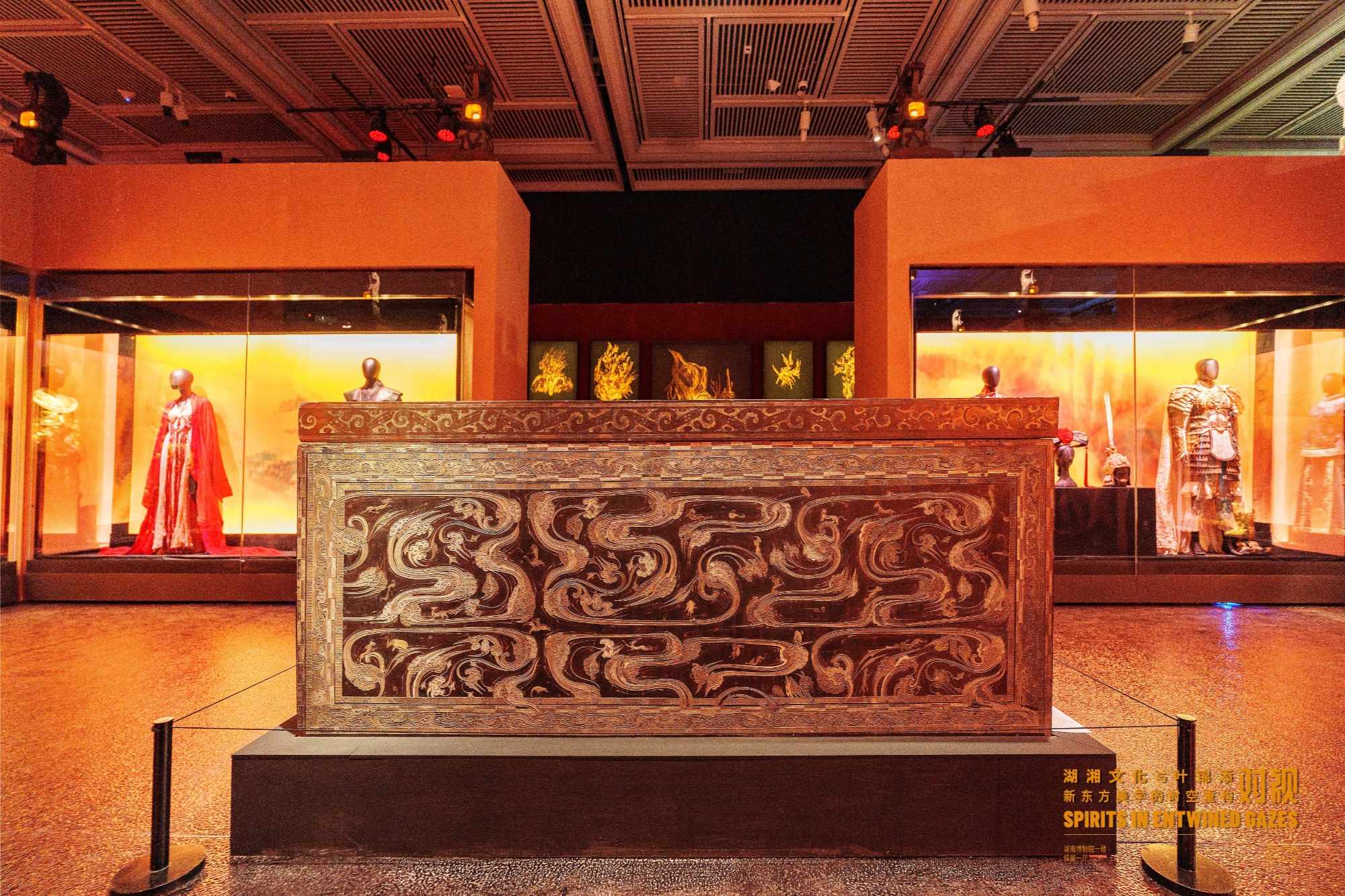 绘有神怪弹瑟图案的黑地彩绘漆棺(复制品)(央广网发 受访者供图) 在申国辉看来,马王堆汉墓出土的丝织品,本身就是一座 “立体化的汉代服饰资料库”,且这份珍贵的文化资源始终保持 “开源” 特质。“辛追夫人墓中出土的双层九子漆奁,上层空置,下层九个形制各异的小盒里,曾摆放着梳子、篦子、镊子等梳妆用品。漆奁上的云气纹精致浪漫、线条流畅,无论是艺术创作者还是汉服爱好者,都能从中汲取创作灵感,我们始终以开放的态度,让这些文物走出博物馆的展柜。” 这份“开放”特质,成为文物与当代艺术并置的关键支撑:文物不再是孤立的历史标本,而是为当代创作提供审美源头与文化根脉;当代艺术则以新东方美学的视角,重新解码文物背后的精神内核,让汉代的生活美学、楚地的浪漫主义,被当下观众真切感知与共情。当T形帛画中“天地人”的宇宙观,遇上当代艺术对“东方哲思”的表达;当双层九子漆奁的云气纹,成为现代视觉设计的东方美学符号,“文物只属于过去”的认知壁垒被彻底打破,传统文化的内核也在当代审美语境中找到了全新表达形式——既守住了文物的历史本真,又激活了其当下的文化价值。 湖湘文化链接当下审美,从文物特质到日常好物的深度联结 马王堆汉墓作为湖湘文化的核心遗存,其文物蕴藏的审美与文化内核,正通过“对视”展的呈现,从“博物馆里的历史”变为“可感知、可借鉴的生活美学”。申国辉在特展现场的分享,让观众得以触摸到两千年前湖湘大地的生活温度。 “辛追夫人使用的便面,也就是小竹扇,既能扇风纳凉,遇到不宜相见之人时,还能当作遮脸的器具;当我们讲到‘辛追夫人也吃香瓜、杨梅、甜枣’时,孩子们的眼睛瞬间亮了起来。” 这些鲜活的生活细节,成为展览传播的新爆点——展览营造的汉代生活场景,让观众直观感受到两千年前湖湘地区的生活风貌,也为当下公众品鉴“传统生活美学”提供了具体的历史参照:如今我们日常享用的休闲甜品、实用好物,早已在汉代的湖湘大地留下生动印记。 而马王堆丝织品的价值,更是湖湘文化链接当代创作的核心纽带。此次全球修复后首次展出的西汉绛紫地“长寿绣”丝绵袍,其纹样、色彩、织造工艺堪称“汉代服饰研究的核心宝藏”。如今,众多汉代题材影视剧的服装设计,均可追溯至马王堆出土的漆木器与服饰;汉服爱好者也从“长寿绣”“乘云绣”等纹样中提取灵感,融入现代汉服设计。
