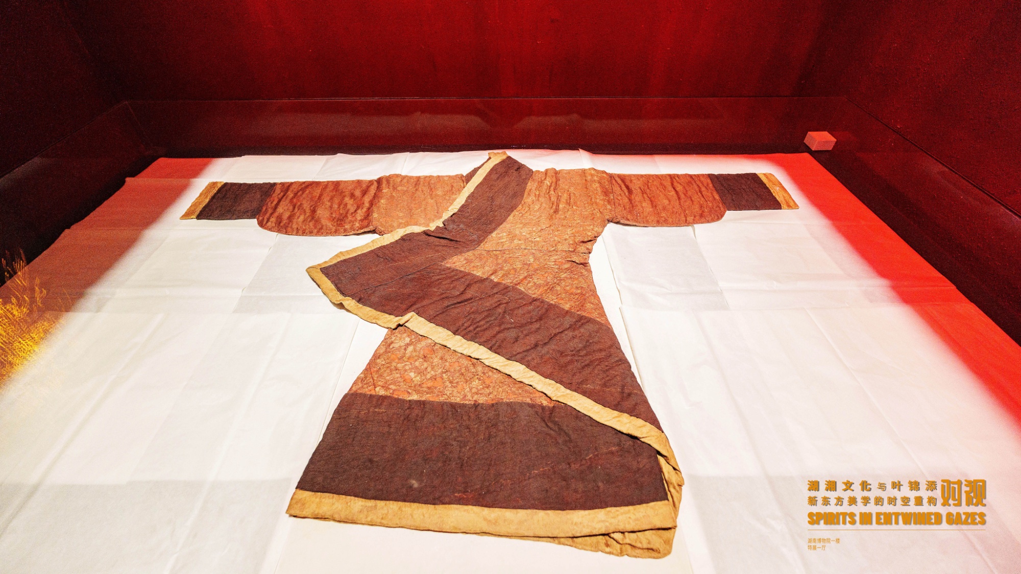 经修复后在“对视”展全球首展的西汉 绛紫地“长寿绣”丝绵袍(央广网发 受访者供图) 湖南省博物馆的开放胸襟,让湖湘文化的审美基因不再局限于展厅,而是转化为当代艺术创作、日常审美品鉴的鲜活素材,真正实现了从 “历史遗存”到“当下养分”的充分转化。 马王堆“常研常新”,是技术赋能与展览创新的双重实践 “马王堆汉墓是一座宝库,常研常新。”走出展厅,申国辉的感慨,道尽了这座千年遗存的独特魅力。这份“新”,既体现在学术研究的维度,也扎根于展览传播的创新。 在学术研究维度,“新” 源于前沿科技赋予的解读新视角,这也是 “对视”展能呈现多元文物内涵的基础。申国辉在特展现场以T形帛画为例,讲述科技赋能让这件马王堆汉墓随葬品有了“新解”。他介绍说,红外扫描技术检测出画中两个守门神有明显“改绘”痕迹,这一发现修正了以往对汉代绘画“一次成型”的认知,让隐藏在岁月背后的创作细节重见天日。此外,高精度数字化、虚拟复原技术的应用,让马王堆文物在数字世界实现“永生”,既减少了实物展出的损耗,也为后续研究留存了完整数据,成为马王堆“常研常新”的核心实践。