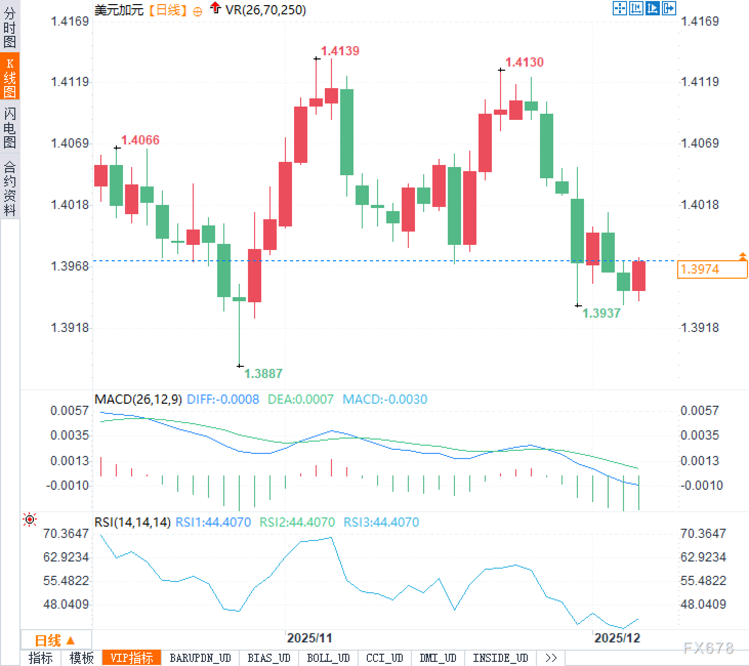 0周四(12月4日),美元兑加元汇价在北美时段延续反弹态势,现报1.3974。此前汇价自1.4130附近高位回落,于近期触及五周低点1.3937,随后展开技术性修复。从更宏观视角审视,美元兑加元短期趋势仍偏空头,过去不足 ...