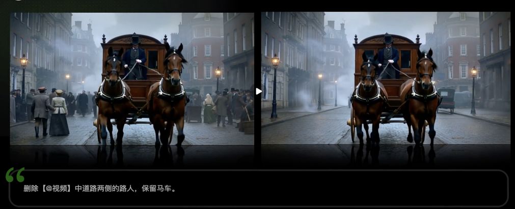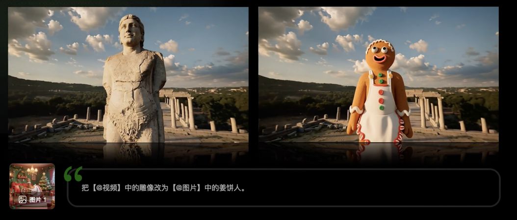 除了用文字指令删除、增加内容外,还可以用图片指令修改视频的主体等。比如,输入“将【视频】中的雕像修改为【图片】中的姜饼人”,生成的视频保持了原视频的运镜逻辑、背景一致,主体也按要求进行了替换。