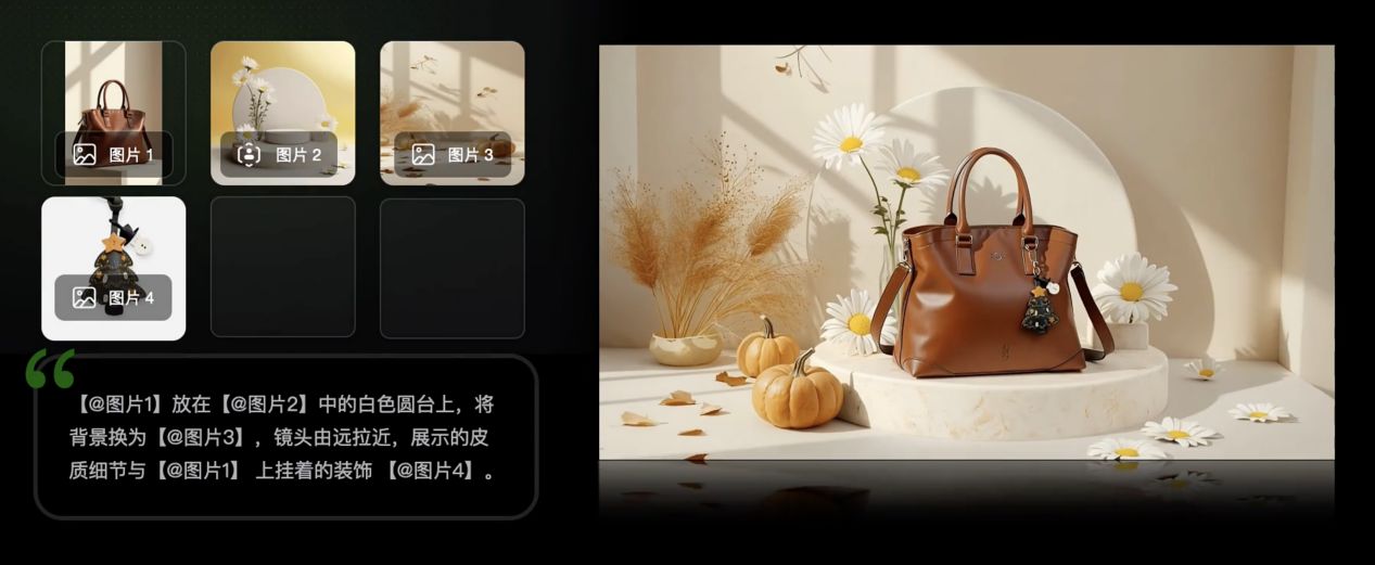 此外,记者体验时还发现,不仅限于单个角色或物品,可灵O1还具备多主体融合能力。可以自由组合多个不同主体,或将主体与参考图混搭。这种能力适用于视频里呈现复杂的群像戏或互动场景中,模型能够独立锁定及保持每一个角色或道具的特征。不过,这个功能需要提供高清、主体明确的图片,否则需要重复“抽卡”。而在复杂的互动场景下,多个主体的互动指令也需要更明确地描述,不然就难以避免重复“抽卡”。 在实际场景落地中,如宣传视频就可以直接上传商品图、场景图等,通过多个主体相互组合快速完成视频生成。