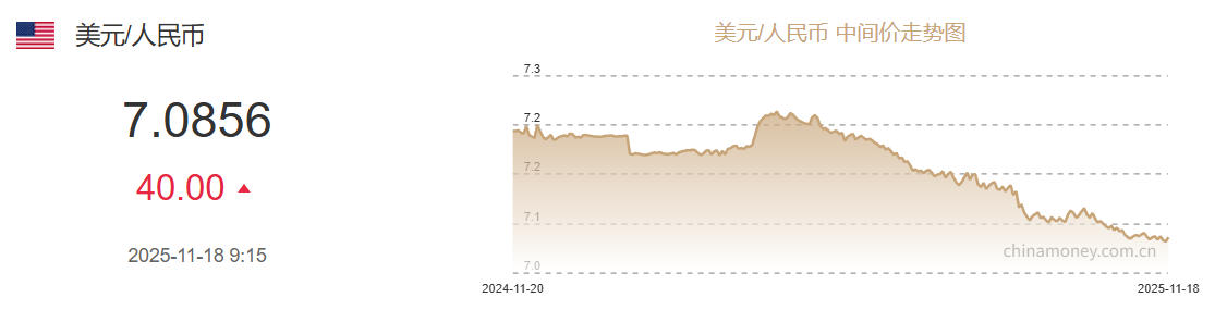 0据中国外汇交易中心网站消息,中国人民银行授权中国外汇交易中心公布,2025年11月18日银行间外汇市场人民币汇率中间价为:1美元对人民币7.0856元,下调40个基点。图源:中国外汇交易中心网站截图 ...