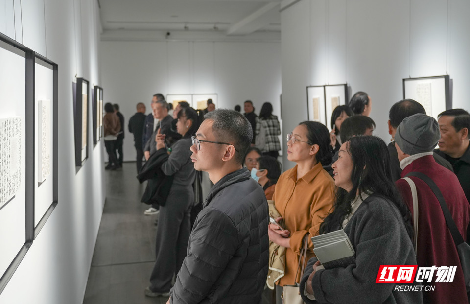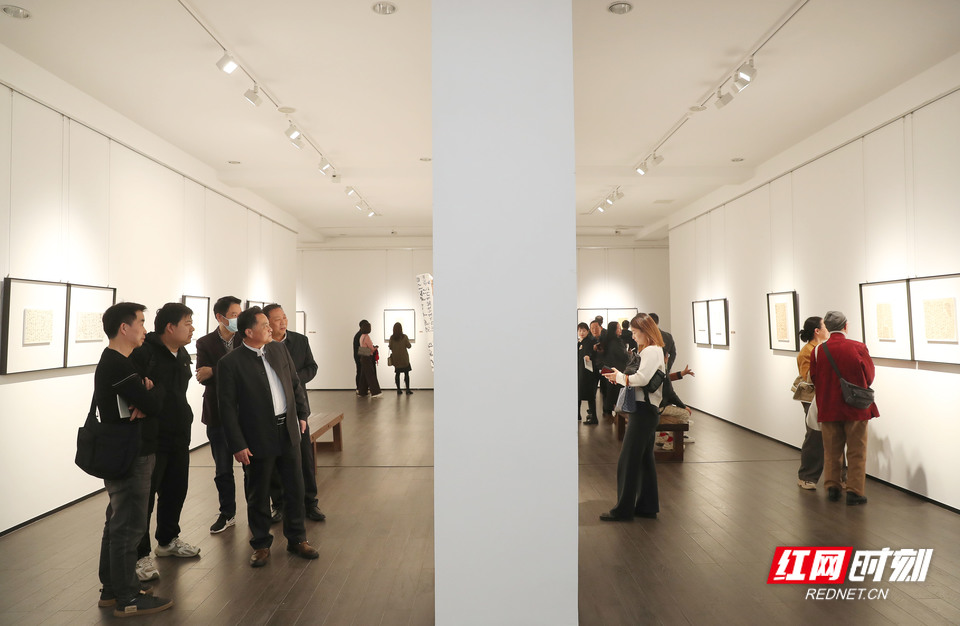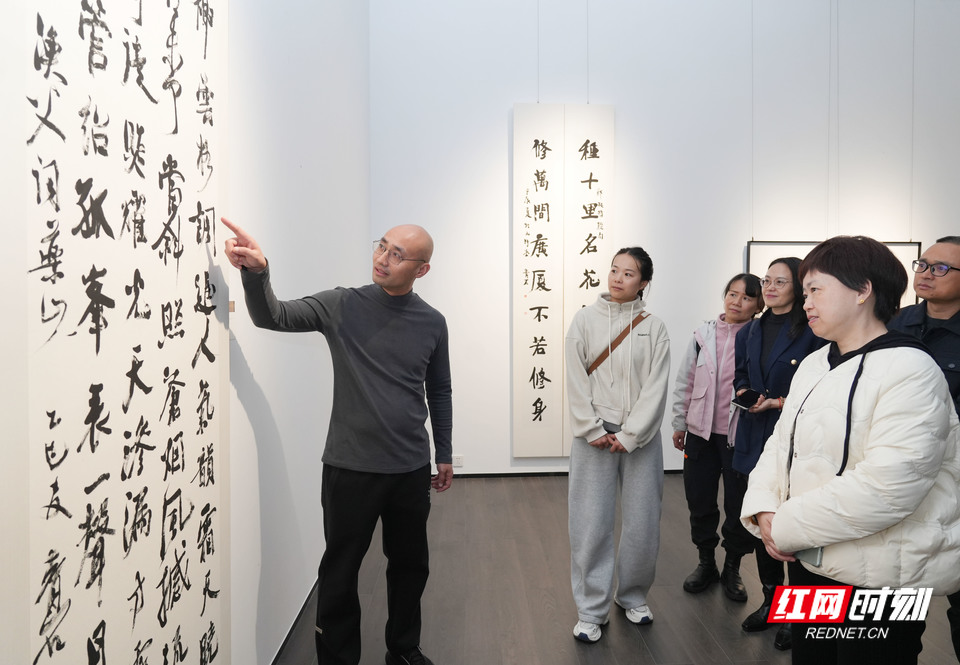 湖南画院,郭宏忠在为观众讲解创作历程。 红网时刻新闻11月29日讯(记者 杨抒怀 陈杰)11月28日下午,“素处以墨——郭宏忠书法作品展”在湖南省画院开幕。本次展览为期8天,共展出90余幅书法作品,展现作者在传统笔墨与现代艺术理念融合方面的探索,吸引不少书法爱好者前往观展。