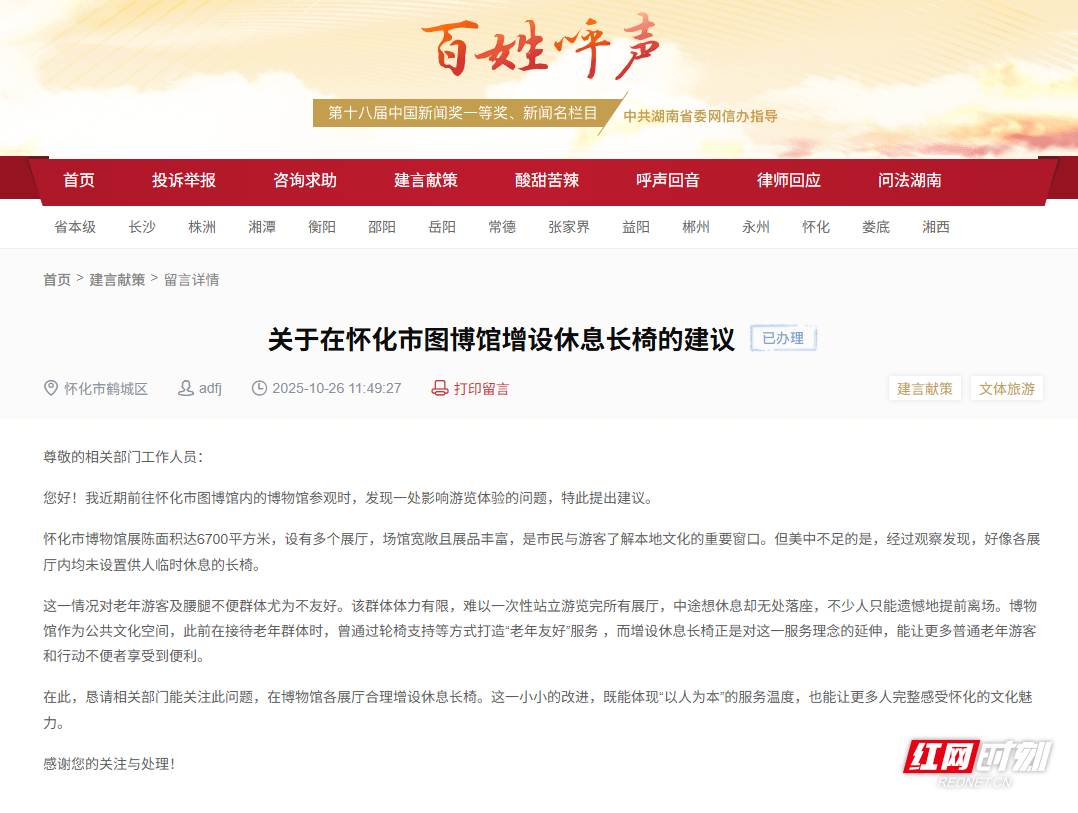 网友在《百姓呼声》栏目上的发帖内容与官方回应。 红网时刻新闻12月2日讯(记者 陈星晓)近日,有网友在红网《百姓呼声》栏目反映,怀化市图博馆内的博物馆各展厅未设置休息长椅,对老年游客及腰腿不便群体造成不便,网友建议馆方可合理增设休息长椅,以提升参观体验。 网友表示,怀化博物馆展陈面积较大,参观需较长时间站立,不少老年及腰腿不便的游客因无处休息而不得不提前结束参观。此前图博馆曾提供轮椅等服务,建议通过增设休息长椅进一步打造友好观展环境。 对此,怀化市文化遗产保护中心(市博物馆)回应称,已关注到相关建议。馆方解释,由于博物馆展厅属于封闭空间,若在展厅内设置长椅,可能引发人员拥堵,存在安全隐患,也不利于文物安全和观众畅通观展。因此,目前展厅内未配置休息长椅。 馆方同时说明,为满足观众休息需求,已在场馆一楼、二楼大厅以及馆外休闲广场等多处公共区域设置了休息长椅,可供观众使用。并表示将继续优化服务,努力为公众提供安全、有序的观展环境。