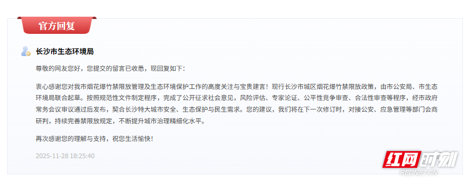 网友在《问政湖南》栏目上的发帖内容与官方回应。 红网时刻新闻12月1日讯(记者 陈星晓)近日,有网友在红网《问政湖南》栏目发文,建议调整长沙市于2025年9月发布的新版城区烟花爆竹禁限放通告,希望将划定的全年禁止燃放区域调整为限制燃放区域,以保留和传承春节民俗。对此,长沙市生态环境局正式作出回应。 网友建议:避免“一刀切”,盼“改禁为限” 网友在建议中指出,2025年实施的新规将望城区及原属限制燃放区域的三环线周边部分区域新增划入全年禁燃范围,覆盖了城区大部分区域,与全国人大法工委“避免全面禁燃、科学划定限放区域”的要求存在出入。网友认为,这压缩了民众传承民俗的空间。 为此,网友建议将上述全年禁燃区域调整为限制燃放区域,并沿用新规中已明确的合理燃放时段,即农历除夕至正月初二及元宵节的特定时段允许燃放。同时,可通过限定燃放品类、设立集中燃放点、加强巡查等方式,实现安全、环保与民俗需求之间的平衡。 相关部门回应:政策经严谨程序制定,承诺研究优化 针对这一建议,长沙市生态环境局在回应中表示,现行的禁限放政策是由市公安局与市生态环境局联合起草,并严格履行了公开征求意见、风险评估、专家论证、公平性竞争审查、合法性审查等程序,经市政府常务会议审议通过后发布。 回复强调,现行政策旨在契合特大城市的安全、生态保护与民生需求。对于网友提出的调整建议,长沙市生态环境局表示,将在下一次政策修订时,会同公安、应急管理等部门会商研判,以期持续完善禁限放规定,提升城市治理的精细化水平。
