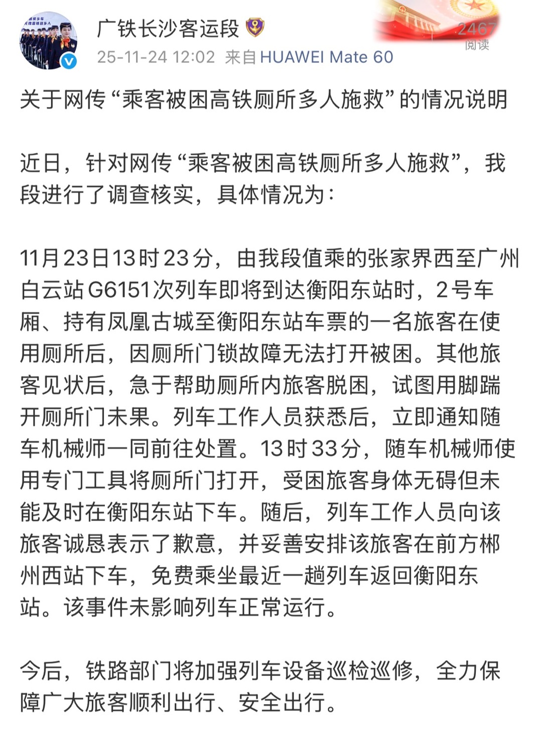11月23日,有网友在社交平台发视频,多名乘客用脚踹高铁厕所门。中国铁路广州局集团有限公司长沙客运段11月24日发布情况说明,公布调查核实情况。具体内容如下: 11月23日13时23分,由该段值乘的张家界西至广州白云站G6151次列车即将到达衡阳东站时,2号车厢、持有凤凰古城至衡阳东站车票的一名旅客在使用厕所后,因厕所门锁故障无法打开被困。其他旅客见状后,急于帮助厕所内旅客脱困,试图用脚踹开厕所门未果。列车工作人员获悉后,立即通知随车机械师一同前往处置。13时33分,随车机械师使用专门工具将厕所门打开,受困旅客身体无碍但未能及时在衡阳东站下车。随后,列车工作人员向该旅客诚恳表示了歉意,并妥善安排该旅客在前方郴州西站下车,免费乘坐最近后续列车返回衡阳东站。该事件未影响列车正常运行。 铁路部门称将加强列车设备巡检巡修,全力保障广大旅客顺利出行、安全出行。