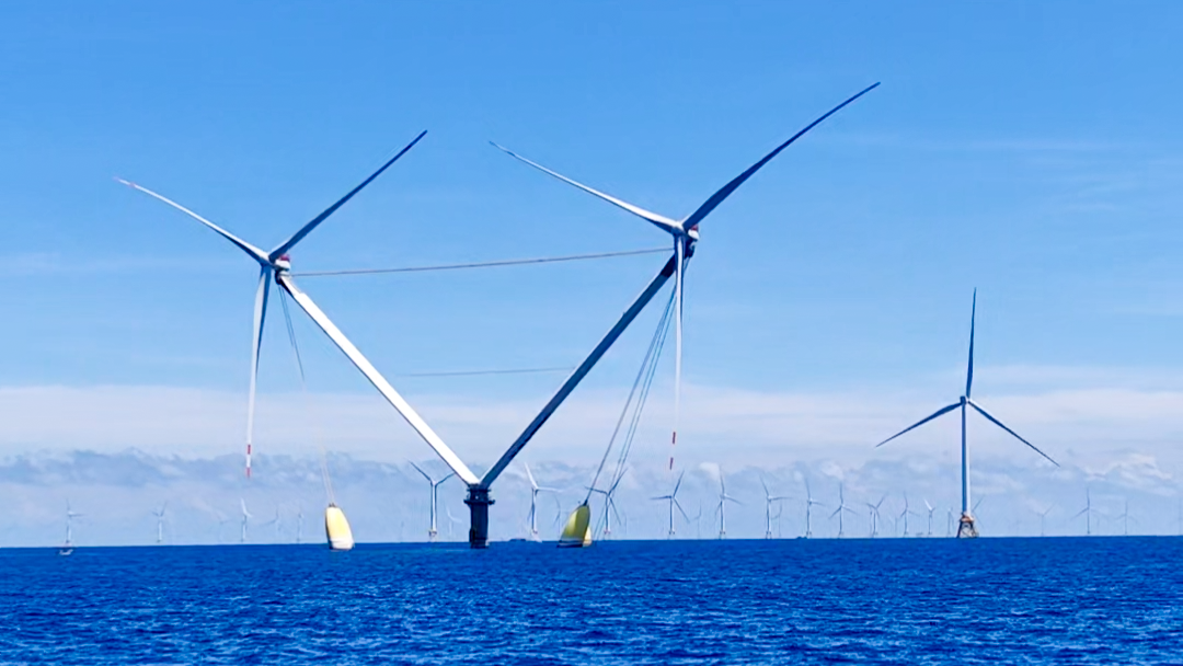 湛江8月开渔现场,渔船在海面划开一道道交错的菱形波痕 在广东西南沿海,“明阳天成号”漂浮式风电平台以稳固的三角结构屹立于碧波之上。一座座风机如海上巨人,迎风展臂,将海风之力转化为清洁电能,通过海底电缆送往远方。三角,是支撑,是延伸,更是海洋能源梦想的几何表达。
