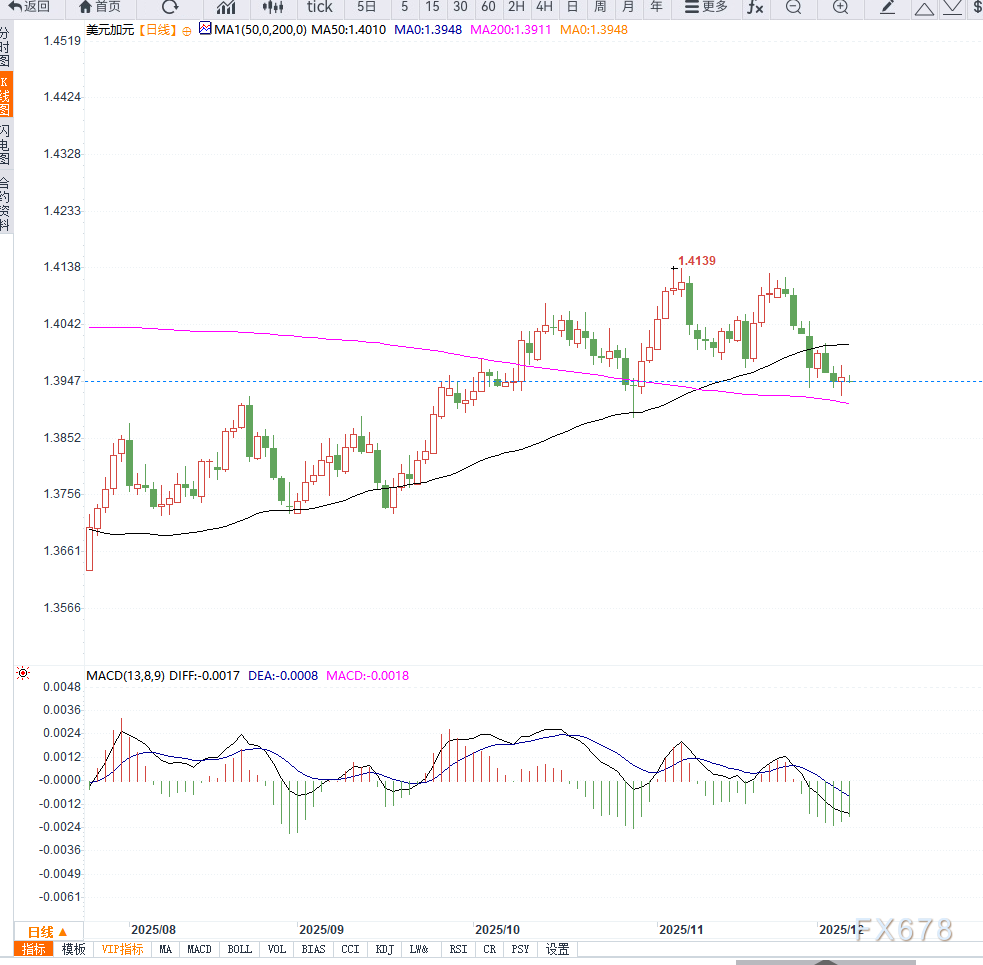 美元兑加元在周五亚洲交易时段徘徊于1.3950附近,波动幅度有限,延续了周四的区间整理格局。 ![]() 与此同时,美元在美联储降息预期下谨慎交易。 据市场调查显示,CME FedWatch工具显示,市场对美联储在12月会议上降息25个基点至3.50%-3.75%的概率为87%。 美联储偏鸽派预期主要受美国劳动力市场状况恶化及通胀压力有限的影响。 短期内,美元兑加元波动受双重因素牵制:一方面是加拿大就业数据的不确定性,另一方面是美联储降息预期的压力。两者叠加,使美元兑加元短线维持区间震荡,难以出现单边走势。 从日线图形来看,USD/CAD维持窄幅区间整理:当前价格徘徊在1.3920—1.3980之间,显示短线买卖力量均衡; 5日与10日均线趋于平行,表明多空暂时僵持; MACD动能柱接近零轴,涨势与跌势动能均有限; 支撑位关注1.3920,下破后可能进一步下探至1.3900心理关口; 阻力位在1.3980附近,突破上方可打开1.4000测试空间。 整体技术面提示,短期仍以区间震荡为主,市场等待就业数据和美联储政策指引。 ![]() 当前美元兑加元走势呈现“美联储降息预期 + 加拿大就业数据待公布 + 技术区间震荡”三重特征。加拿大就业数据的强弱将直接影响加元短线表现,而美联储降息预期已为美元提供结构性下行压力。