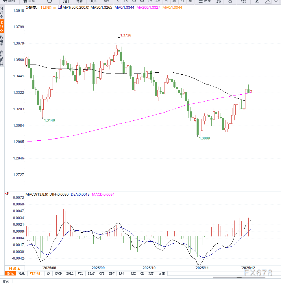 GBP/USD在亚洲交易时段表现平稳,围绕1.3330运行。 ![]() 另一方面,英国经济前景的不确定性以及市场预期英格兰银行可能加快降息步伐,限制了英镑的进一步涨幅。 多数分析师预计英国央行将在12月将利率下调至3.75%,市场定价概率约为90%。 从日线图形来看,GBP/USD短线维持偏多结构: 汇价现报1.3328,稳守 100日指数均线(1.3300) 之上,均线平缓后支撑汇价上行。 汇价接近布林带上轨(1.3348),布带扩张显示波动率上升和多头压力增强。 RSI指标报61,显示动能正向且未达到超买区域。 上方初步阻力:布林带上轨 1.3348,若收盘突破,可延伸上涨空间。 下方支撑:100日EMA 1.3300不破,维持多头上行。 短线偏多格局成立,若守住均线支撑,可维持上行趋势;若回落至中轨附近,可能出现短期整理。 ![]() GBP/USD当前走势呈现“美联储降息预期 + 英格兰银行潜在宽松 + 技术面偏多”三重特征。短期仍以多头震荡为主,但需关注美国PCE数据可能引发的快速波动,同时留意英国央行政策消息对英镑的限制作用。 技术面显示,汇价稳守关键均线并临近上轨,多头趋势未被破坏,但若突破受阻,则可能出现回调整理。