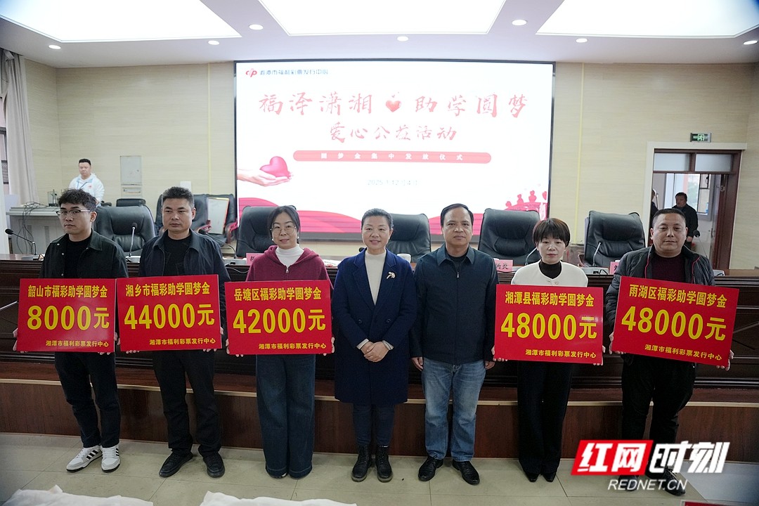 向县一中颁发“福泽潇湘”公益资助项目牌匾。 “圆梦金”全部来源于湖南省福利彩票发行中心2025年“福泽潇湘”公益品牌宣传补助资金,凝聚广大彩民的爱心,体现了福彩“扶老、助残、救孤、济困”的宗旨。湘潭市福彩中心持续多年开展公益助学,已帮助数千名学子圆梦校园,并在教育、扶老、助残等多个领域积极践行公益使命。