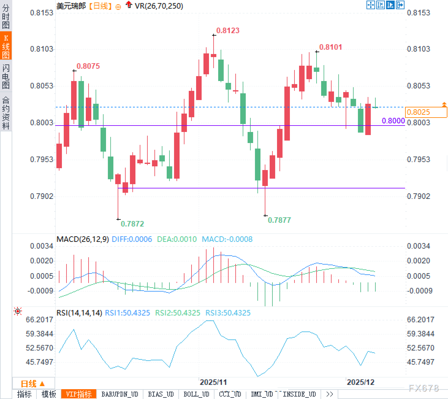 周五(12月5日),美元兑瑞郎在欧洲早盘时段动能减弱,汇价回落至0.8025附近。美联储下周降息预期升温叠加白宫经济顾问凯文·哈塞特可能接任美联储主席的消息,令美元承压走软。与此同时,瑞士11月通胀数据意外走弱,瑞士央行维持宽松货币政策的预期有所强化,多空因素交织下,汇价陷入拉锯格局。 ![]() 美元近期持续承受卖压,主因交易员对美联储12月议息会议降息25个基点的押注大幅攀升。根据芝加哥商品交易所美联储观察工具数据,金融市场目前定价下周降息25个基点的概率已接近85%。宽松预期主导下,美元指数走势疲软。 在美联储人事层面,美国总统特朗普周二表示,计划于明年初公布美联储主席杰罗姆·鲍威尔的继任人选。目前白宫经济顾问凯文·哈塞特已成为下一任美联储主席的热门候选人。分析人士普遍认为,哈塞特倾向于推动更大幅度的降息,这一预期进一步压制美元走势,为美元兑瑞郎带来下行压力。 瑞郎方面,瑞士联邦统计局周三公布的数据显示,瑞士11月消费者物价指数意外降至0%,核心通胀指标更是放缓至四年低位。通胀数据大幅低于预期,强化了市场对瑞士央行将延续宽松货币政策立场的判断。理论上,这一因素应利空瑞郎、利多美元兑瑞郎汇价,为汇价提供一定的下方支撑。然而,在美联储降息预期更为强烈的背景下,美元端的利空暂时主导了行情走向。 技术面: 从美元兑瑞郎日线图来看,汇价当前报0.8025,正处于关键的多空分水岭附近。图表显示,汇价在近两个月内呈现明显的宽幅震荡格局,上方0.8123和0.8101构成双重阻力结构,下方0.7872和0.7877形成双底支撑区域。当前价位正好处于0.8000整数心理关口上方,该位置具有重要的技术意义。 ![]() MACD指标显示,当前DIFF值为0.0006,DEA值为0.0010,MACD柱状图为负0.0008。快慢线虽均位于零轴上方,但DIFF线已下穿DEA线形成死叉,且柱状图由红翻绿后持续收缩于负值区间,显示短期动能偏向空头。这一信号与价格走势形成印证,表明汇价在当前位置面临一定的下行压力。然而,MACD尚未出现明显的空头发散迹象,柱状图绝对值较小,暗示下跌动能并不充沛,行情仍有在当前区间内继续整理的可能。 RSI指标方面,当前录得50.4325的读数,精准位于50中轴线上方。这一数值表明汇价目前处于多空均衡状态,既无明显的超买压力,也未进入超卖区域。RSI近期一度跌至45区域下方,随后伴随价格反弹回升至中性区域。当前RSI在50附近横向运行,与价格的震荡格局相呼应,暗示短期内汇价可能延续区间整理态势,方向性突破仍需等待更明确的催化因素。 后市展望: 短期视角下,汇价在0.8000至0.8050区间内的拉锯格局预计将延续至关键数据落地。若美国个人消费支出物价指数符合或低于预期,美联储12月降息将基本板上钉钉,美元兑瑞郎可能下探0.7950乃至0.7900区域的支撑。技术面上,有效跌破0.8000整数关口将打开进一步下行空间,0.79将成为首要防守位。 多头情景下,若美国通胀数据意外走强或美联储官员发表鹰派言论,汇价有望反弹测试0.8050阻力,进一步目标指向0.8100至0.8120区域。突破0.8123前高则将确认中期上行趋势的恢复。 中期来看,美联储货币政策路径与主席人选的不确定性仍是主导汇价走向的核心变量。若哈塞特最终接任美联储主席并推动更激进的降息步伐,美元可能面临持续性贬值压力,美元兑瑞郎不排除下探0.7800一线的可能。然而,瑞士央行同样面临低通胀困境,若其在12月议息会议上释放更强的鸽派信号甚至超预期降息,瑞郎走强的势头将受到抑制,汇价存在企稳反弹的空间。