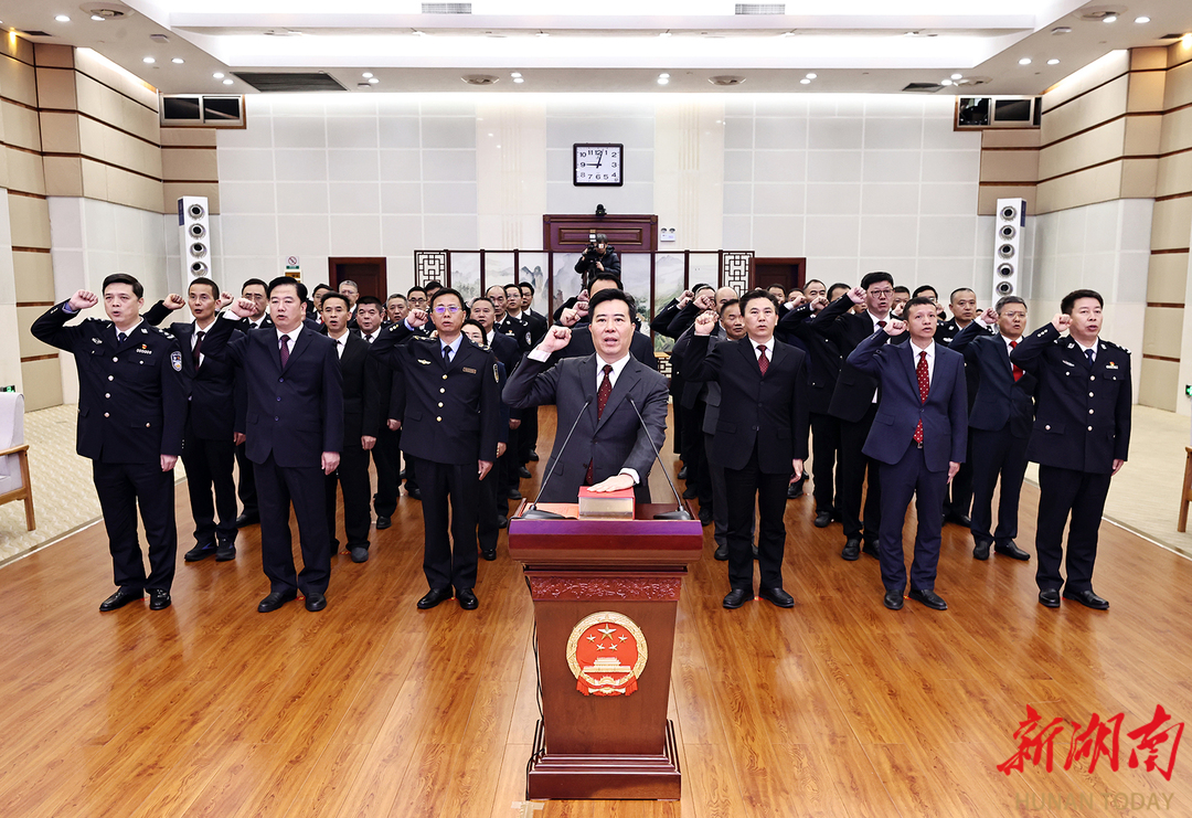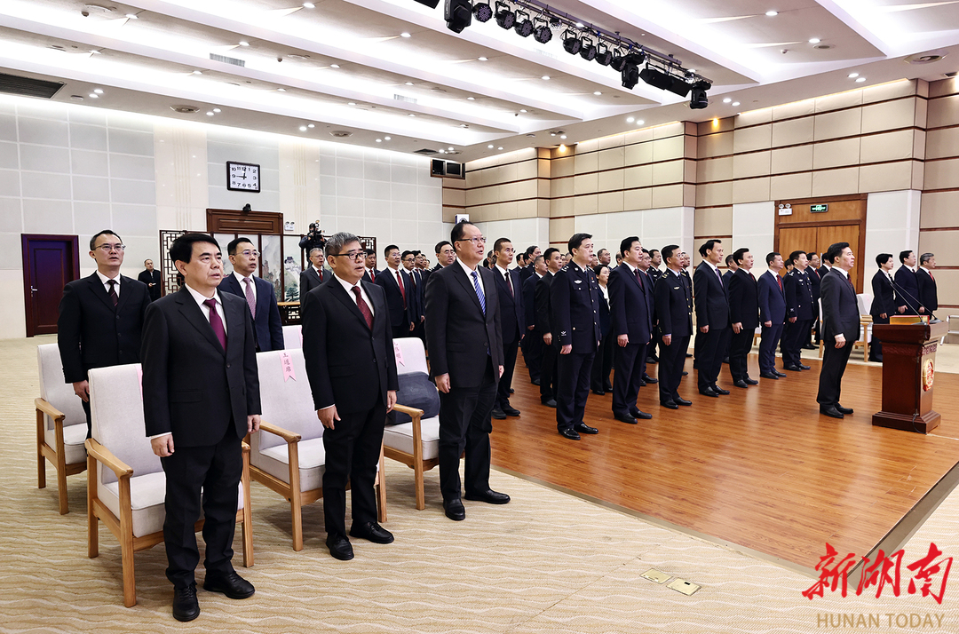 全体奏唱国歌。 宣誓后,毛伟明指出,宪法宣誓既是一项法定仪式,更是一项庄严承诺。大家要珍惜职责、不负重托,更好依法履职、担当作为。要坚持绝对忠诚本色。始终旗帜鲜明讲政治,始终在思想上、政治上、行动上同以习近平同志为核心的党中央保持高度一致,确保党中央决策部署在湖南落地生根、开花结果。要坚持依法行政原则。把依法行政贯穿于决策、执行、监督和服务全过程各方面,持续提高运用法治思维和法治方式深化改革、推动发展、化解矛盾、维护稳定、应对风险的能力,让法治成为政府工作的鲜明底色。要坚持为民服务初心。用心用情办好每一件民生实事,千方百计解决好群众急难愁盼,实现好、维护好、发展好最广大人民的根本利益,让民生福祉更加可感、可及。要坚持清廉从政底线。始终把深入贯彻中央八项规定精神学习教育常态化、长效化,持之以恒改作风、树新风,时时自警、自省、自律,处处慎权、慎独、慎微,做到一心为公、一身正气、一生为民。 图片/湖南日报全媒体记者 刘尚文 摄 |