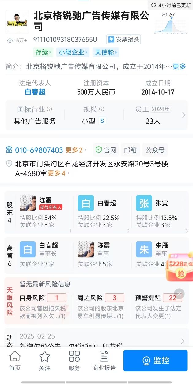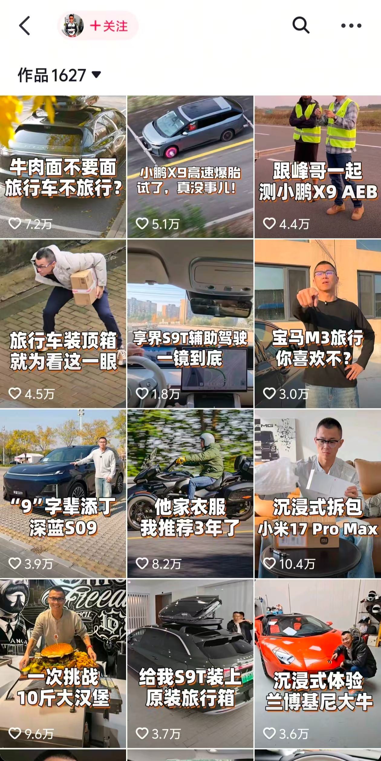 此外,其任职公司还有北京格锐新峰信息技术有限公司、北京格锐诚品商贸有限公司。并担任天津市滨海新区账户陈震数字文化创意内容制作工作室法定代表人。 财闻注意到,近一个多月以来,陈震抖音平台发布视频超过30条,其中涉及多个商业品牌,疑似商单的包括享界的S9T测评,小鹏x9极端全场景爆胎测试,以及深蓝S09、宝马M3等,其中,享界的S9T测评超过4条,小鹏x9相关视频也有3条。 12月以后,其共发布四条视频,其中最后一条汽车测评相关内容为零跑Lafa5。