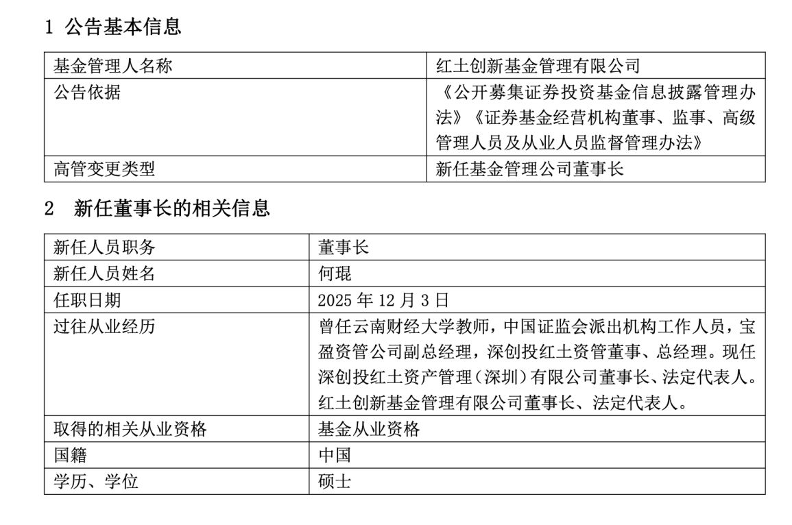 红土创新基金迎来新董事长12月5日晚间宣布高管变更的还有红土创新基金。 根据公告,何琨新任红土创新基金董事长、法定代表人,任职日期从12月3日起。今年6月,红土创新基金原董事长阮菲因董事会到期换届离任,公司总经理冀洪涛代任董事长职务。如今何琨到任,冀洪涛也不再代任董事长一职。