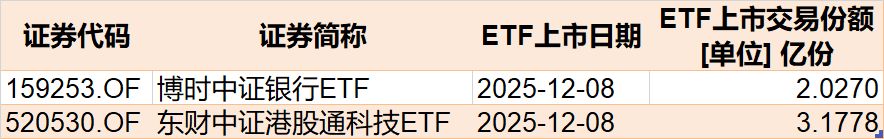 其中,香港证券ETF、A500ETF基金周成交额超300亿元。另外,本周香港证券ETF创近60日新低。 有机构表示,当前环境下中长期资金加速入市,市场活跃度维持高位,资本市场展现出“健康牛”态势,财富管理转型、国际化业务拓展、金融科技赋能均有望成为行业提升ROE的驱动力,看好证券行业2026年投资机会。当前板块估值处于历史较低位,防御与反弹攻守兼备。建议关注综合实力强劲的头部券商,以及在财管、自营、跨境等领域具备差异化竞争优势的券商。 8只ETF下周发行 基金重仓股向来是投资者关注的热点,但是主动管理型基金的重仓股浮出水面,通常都有一定的滞后性,而ETF布局的标的却是非常明确的,通过跟踪新上市ETF,通常可以发现近期热点个股,新上市ETF带来的增量资金也值得关注。 目前有2只ETF披露下周上市,跟踪标的为银行、港股科技等。