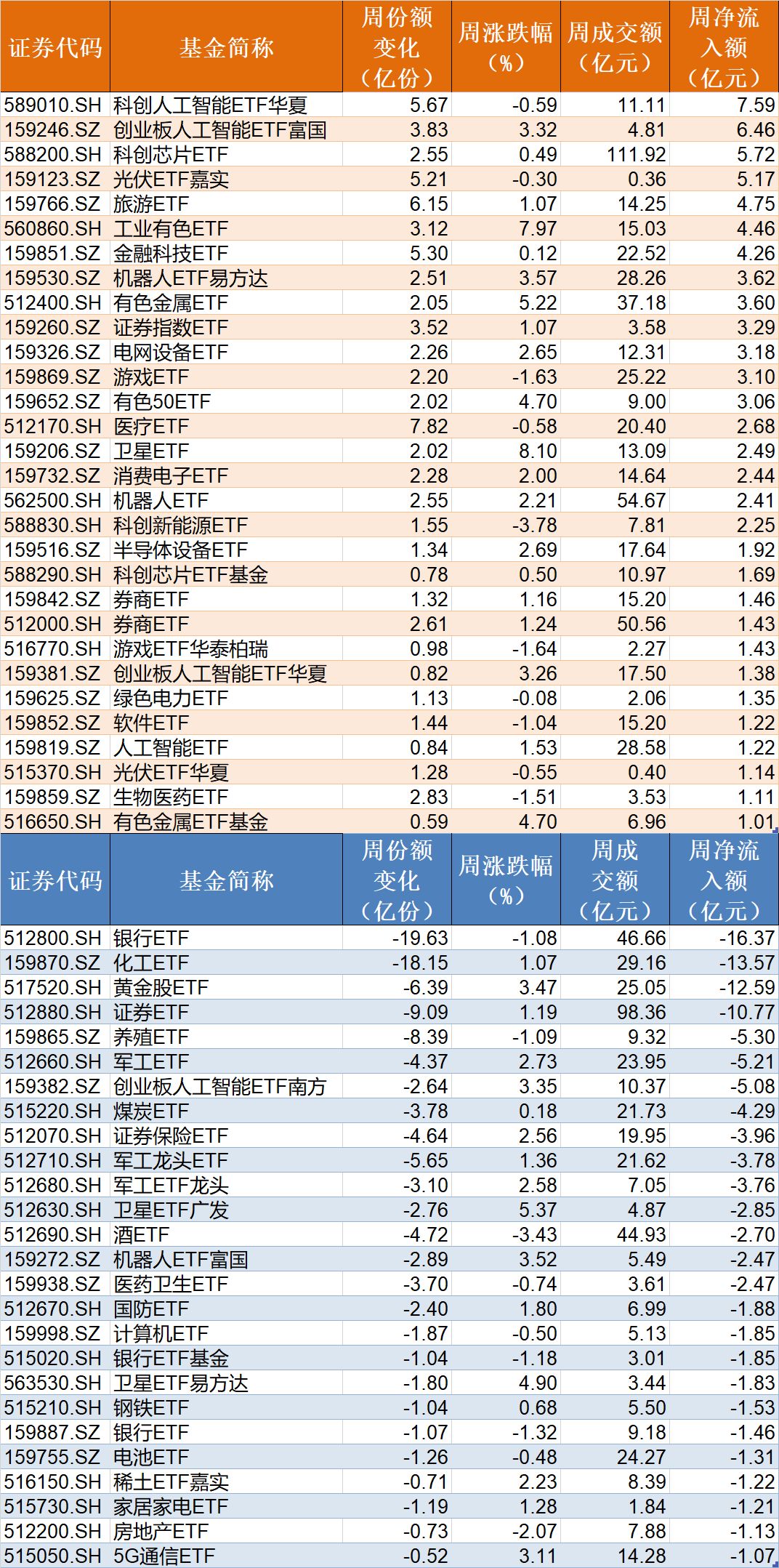 创业板人工智能ETF富国(159246)基金份额变化 有机构分析表示,人工智能行业正处于快速发展阶段,技术创新和应用场景不断拓展。随着政策支持力度的加大以及市场需求的增长,人工智能产业链将迎来新的发展机遇。特别是中上游的基础技术领域如芯片、算法框架等,将成为未来投资的重点方向,人工智能的长期投资价值显著。 14只ETF周成交额超100亿元 本周,股票型ETF和跨境型ETF中成交额超100亿元的ETF有14只。