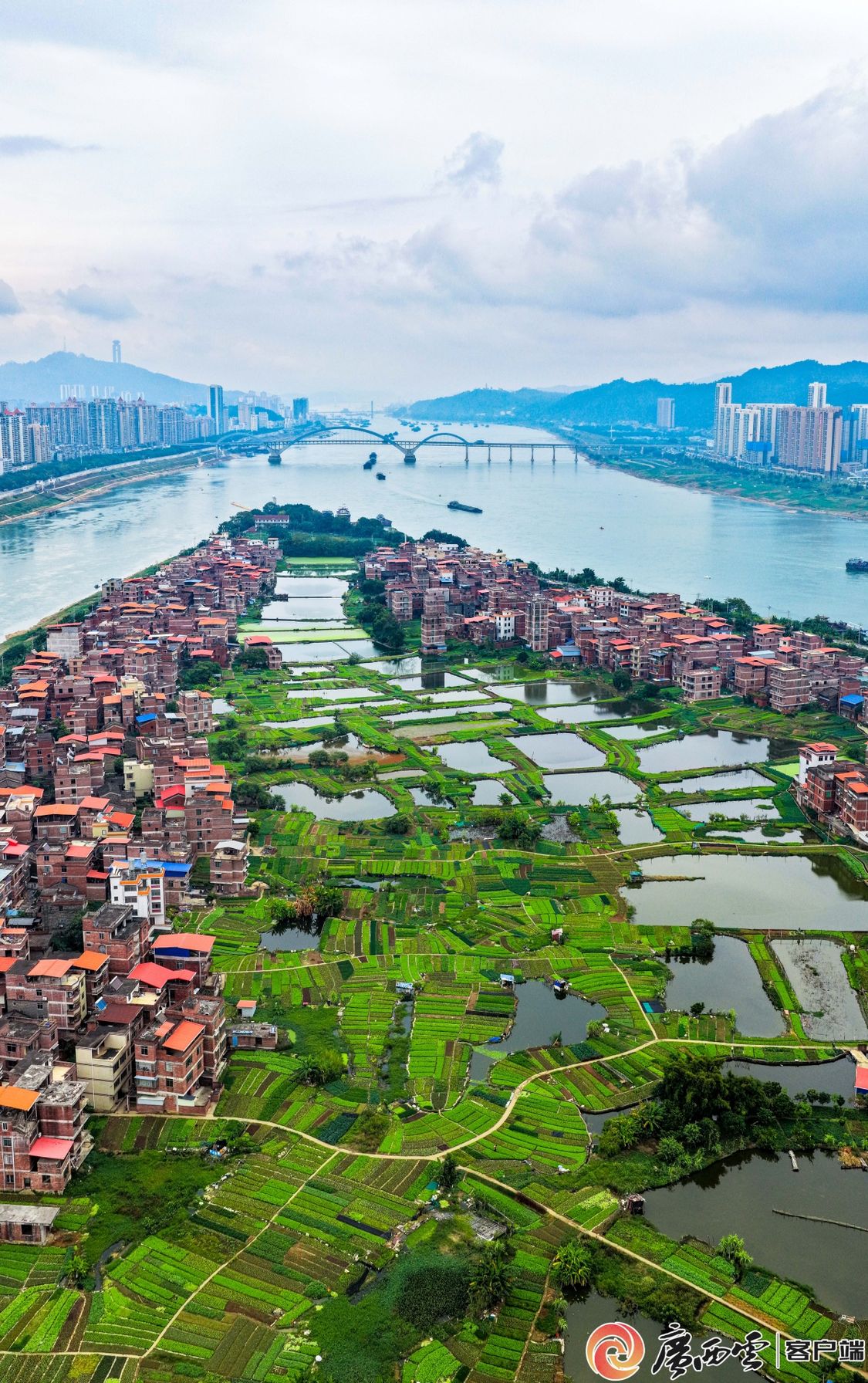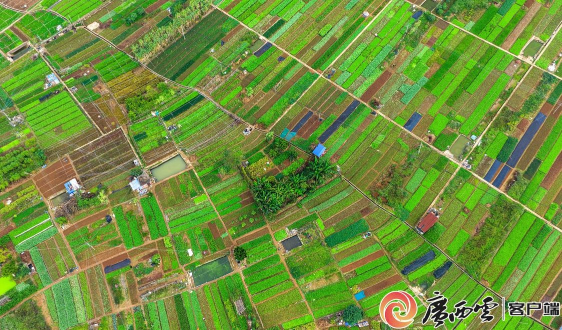 梧州市长洲区长洲岛生态蔬菜基地航拍。颜金昌 摄 菜苗在此寻得生长韵律 比别处早醒7天 这是自然对勤劳的温柔偏爱 那些带露菜心、凝露菌菇 “粤桂门户”的千年通衢 化作4小时的现代捷途 恰似奔赴山海的邀约 直达湾区灯火璀璨餐桌