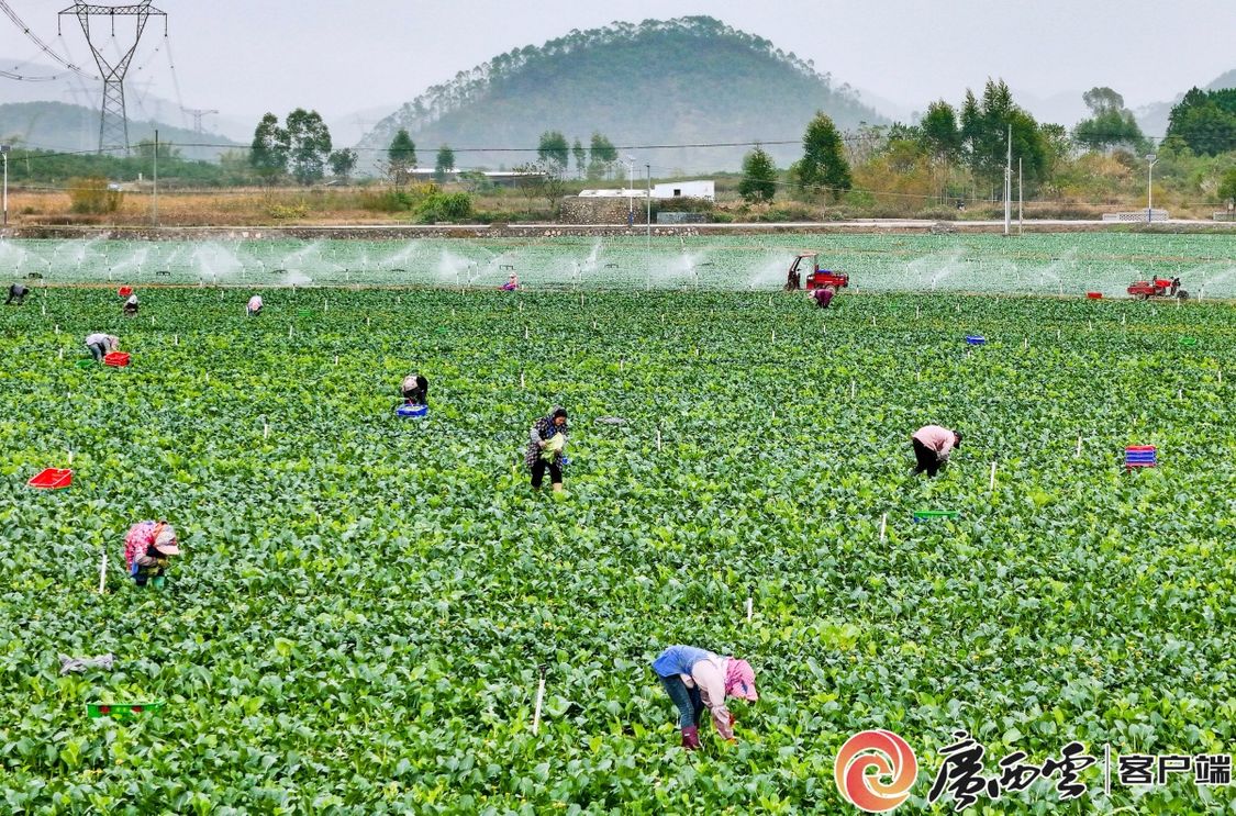11月9日,梧州市龙圩区广平镇调村生态蔬菜种植基地,村民忙于采摘新鲜蔬菜供应粤港澳大湾区市场。近年来,该市着力打造“一村一品”“一乡一业”特色产业,助农增收。颜金昌 摄 当北国银装素裹 八桂大地仍铺展着翡翠般的菜畦 亚热带季风轻抚这片土地 将全年无霜期的馈赠化作秋冬菜的丰饶诗行 广西秋冬蔬菜已播1310.18万亩 1500万亩秋冬菜着手酝酿跨越山海的旅程 来自稻菜轮作的智慧 “早稻+晚稻+冬菜”的韵律在田间回荡 每一寸土地都跃动着增收的节拍 冷藏车穿越晨雾 将新鲜送达远方 车轮碾过的是希望之路 留下的是温暖的印记 从传统种植到智慧农业 从田间地头到万家餐桌 这片土地正用绿色书写富民故事 振兴之路,我们从菜畦出发